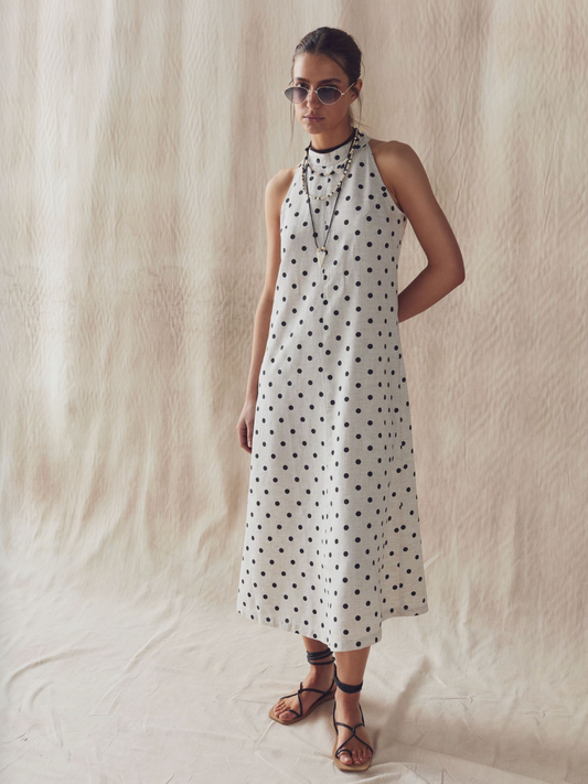 Olivia Linen Dress - Natural and Black Polka Dots