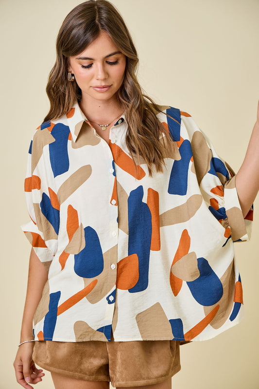 Oversized Geometric Print Button Down Shirt - Cream/Rust/Navy