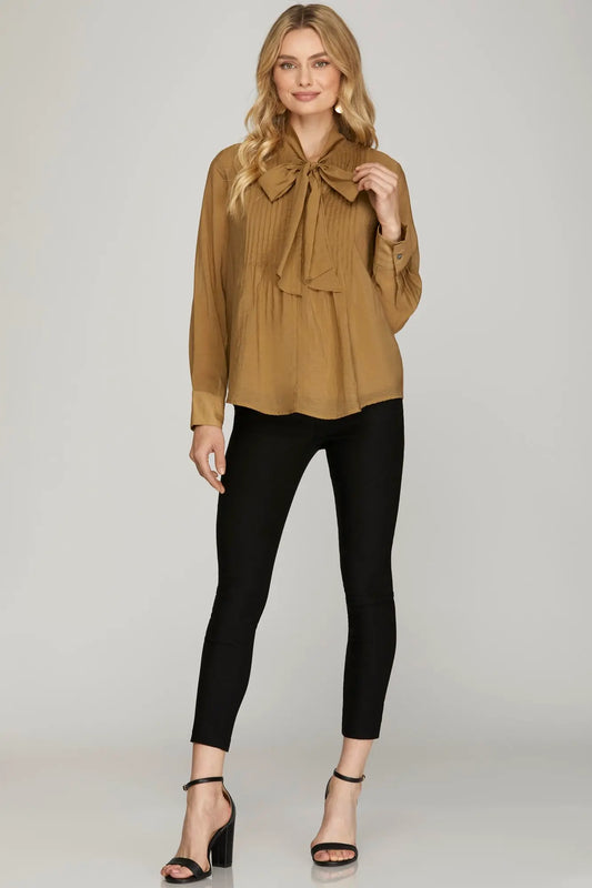 Pintuck Blouse Top with Bow - Light Cinnamon