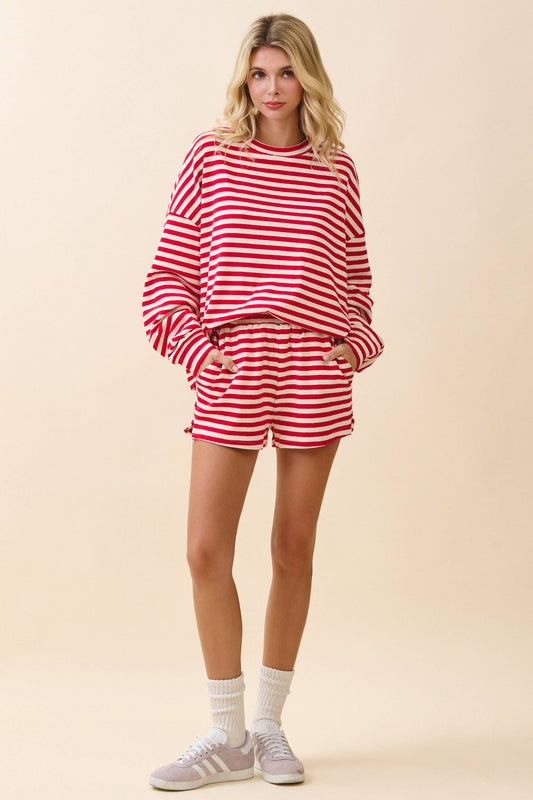 Striped Dropped Shoulders Relaxed Long Sleeve Top - Red