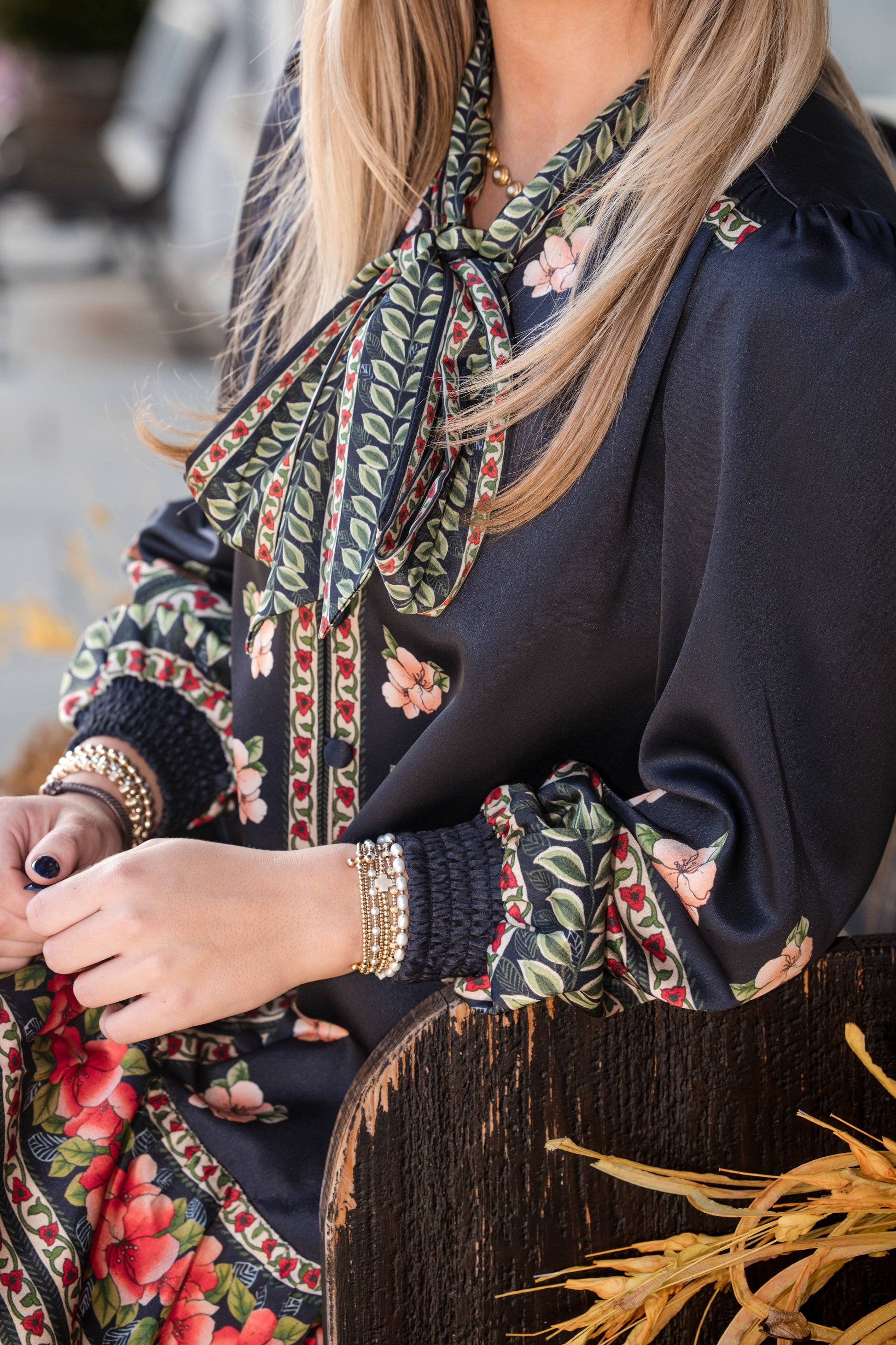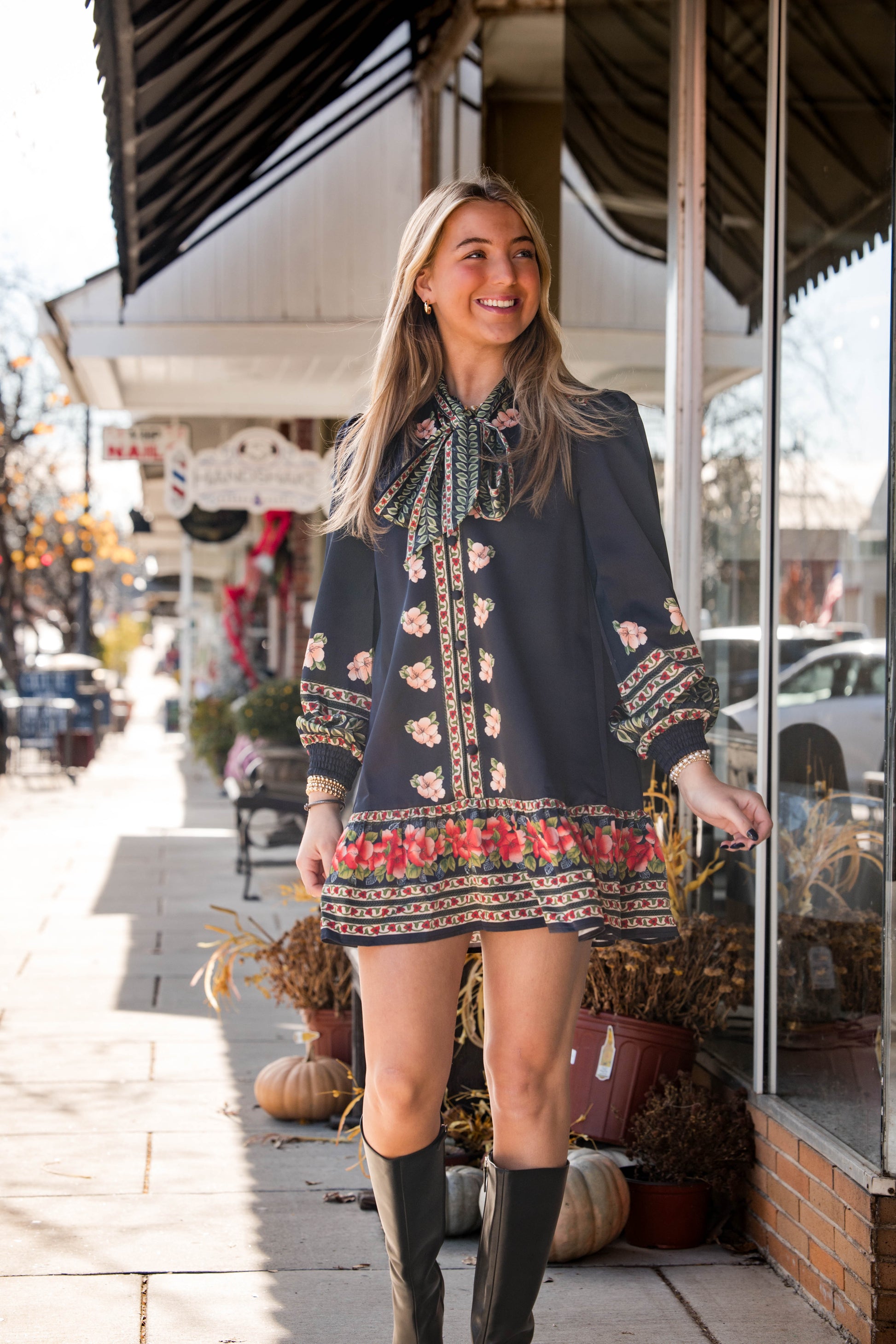 Our darling, feminine Brit Bow blouse just got even better! We added a ruffle hem skirt, turning this vintage 80's inspired silhouette into the cutest Holiday mini dress. Pair with some black tights and heels for an easy, chic look.