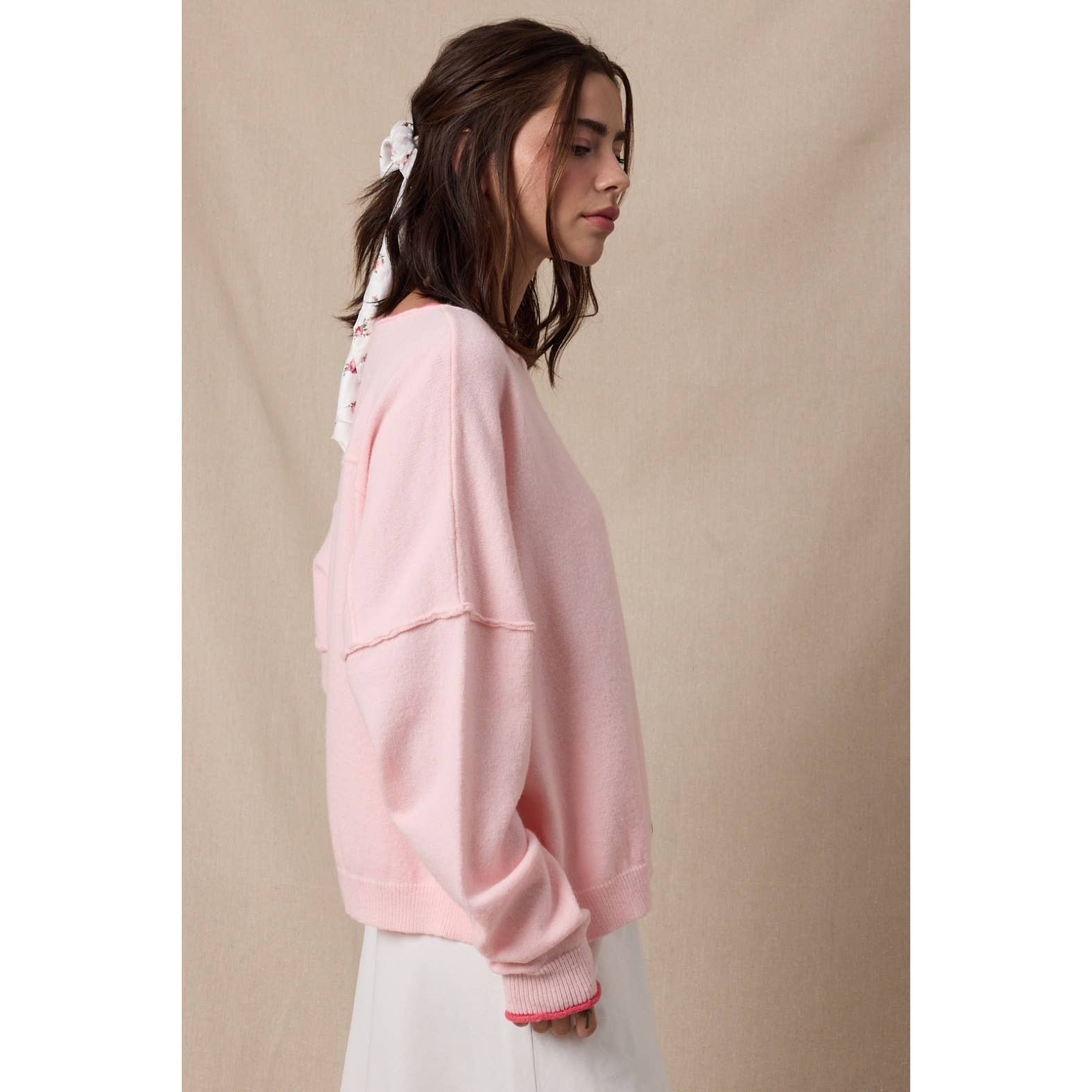 Brushed Contrast Boat Neck Sweater - Pink/Punch