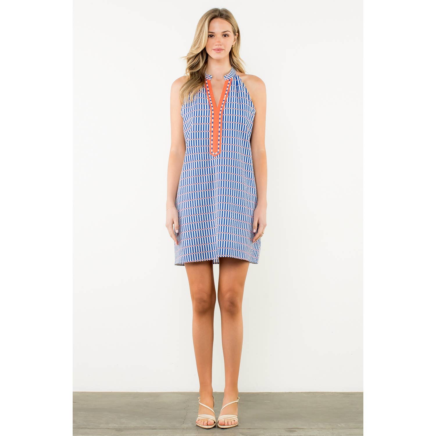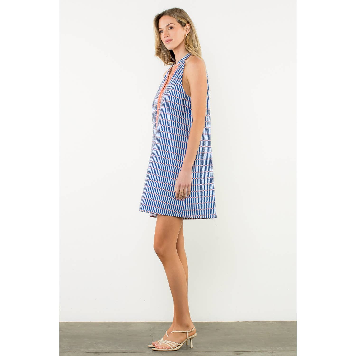Contrast Trim Sleeveless Stripe Dress - Blue