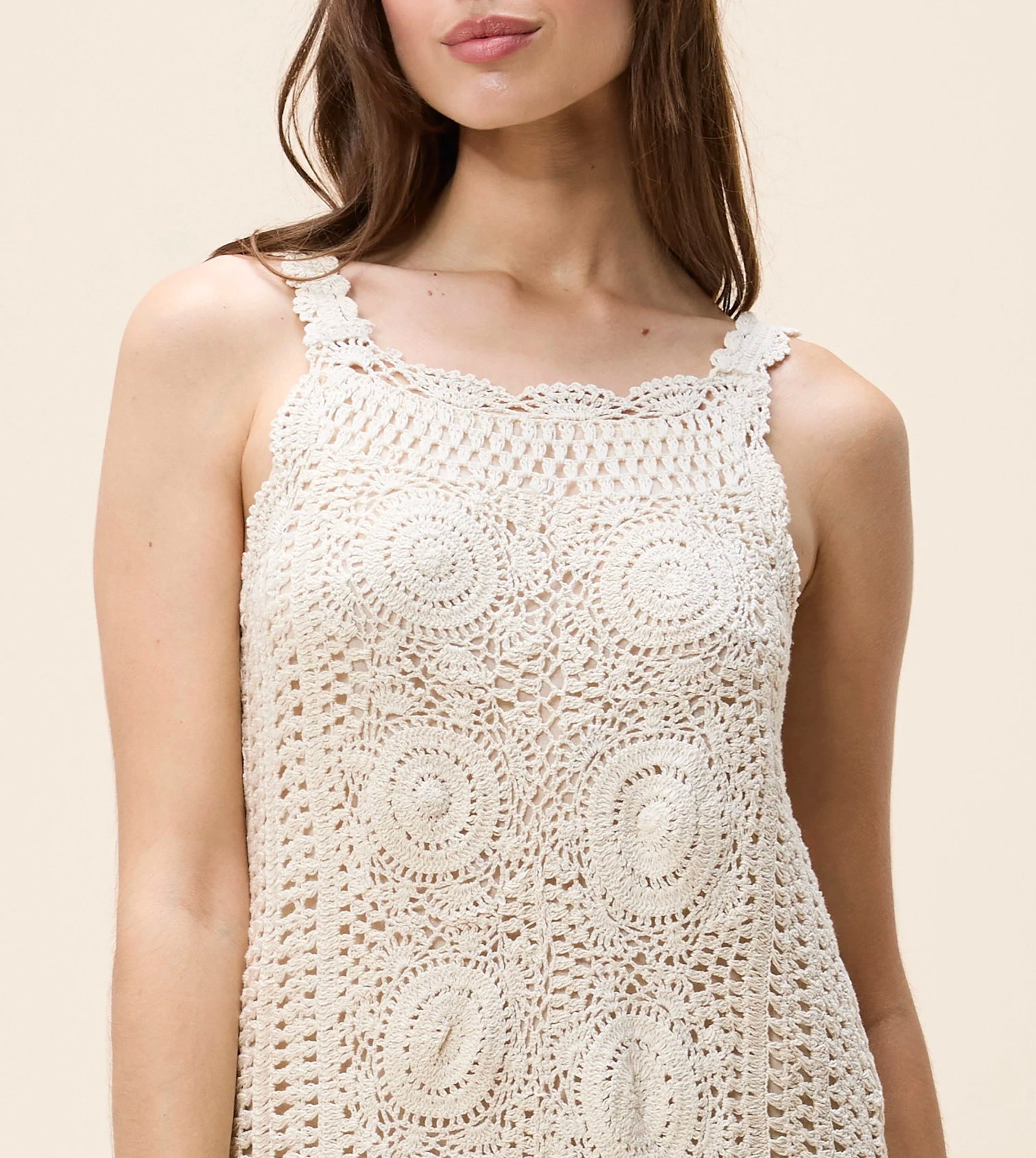 Handmade in cotton yarn, the Danni Mini Dress welcomes the season with delicate scalloped edging at the hem and a gently placed floral motif cascading down the center. Finished with a removable slip for easy wear, this breezy, effortlessly chic style is made for sunny days and warm spring moments.