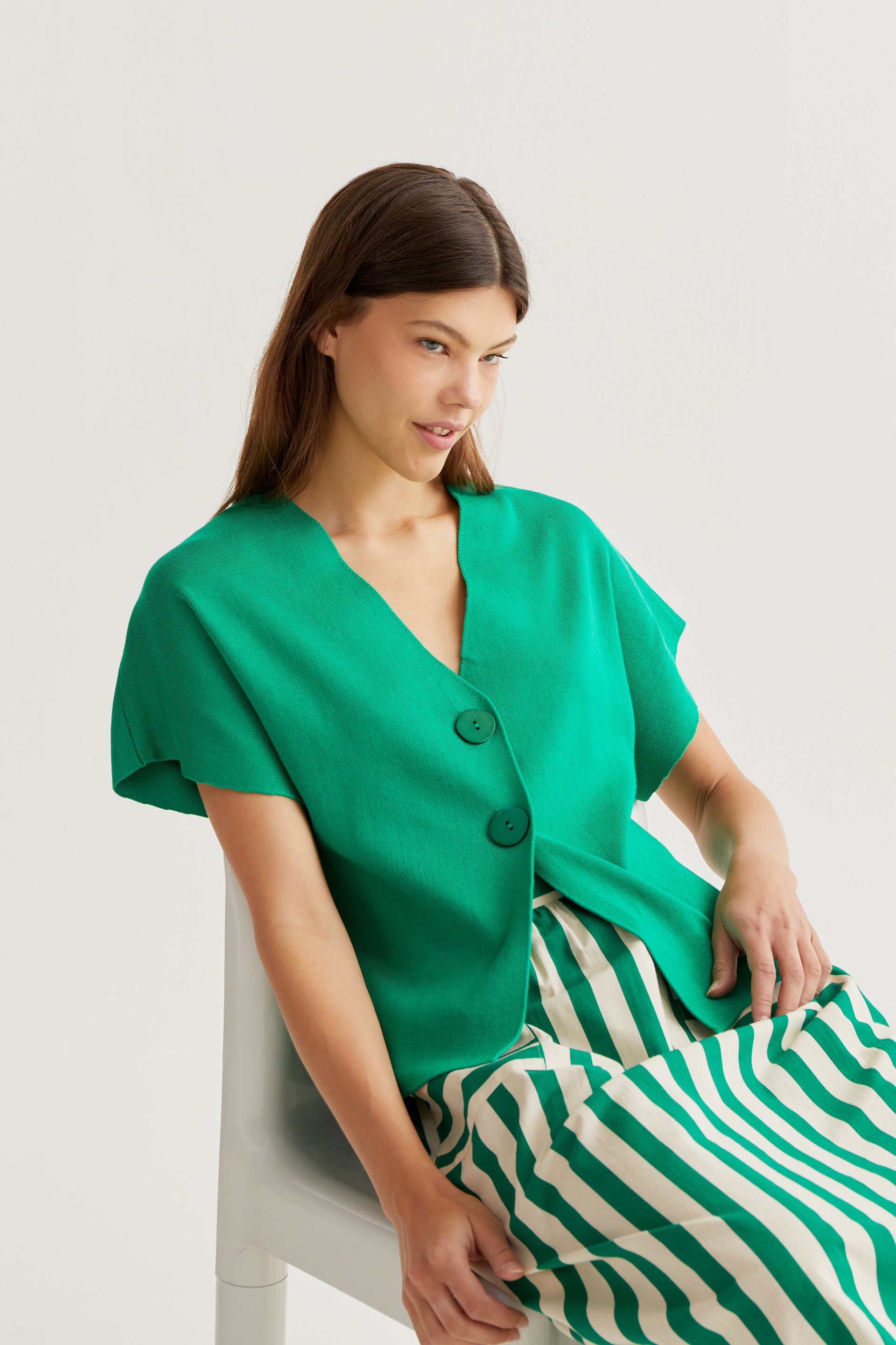 Green knit cardigan. V-neck with short sleeves. Front closure with large green buttons. Slightly dropped shoulders.