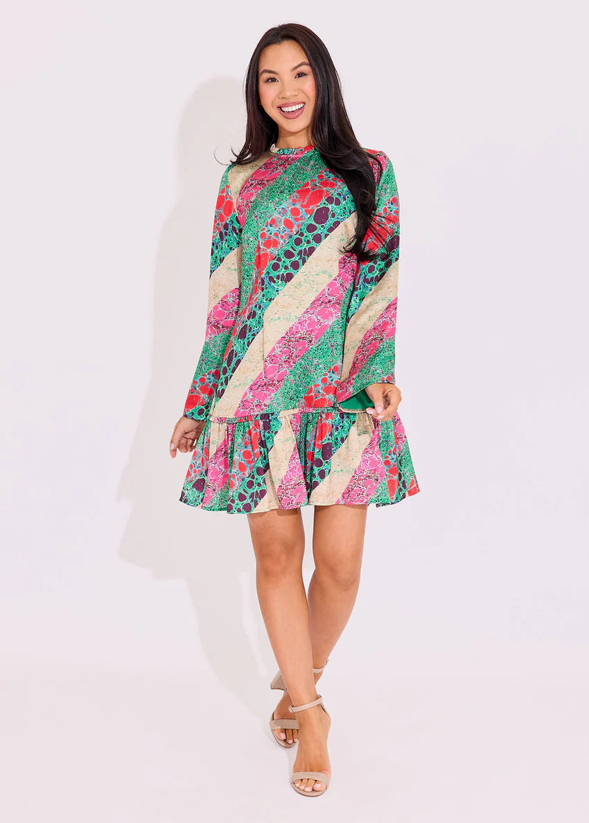 The Duke Dress is a playful and vibrant mini featuring our alabaster print. Its flounced hem and breezy long sleeves add a fun, feminine touch perfect for any occasion.