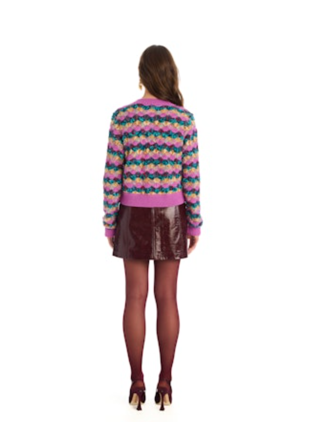 The Vintage-inspired Emerson Cardigan features a hand knit technique finished with a ribbed neckband and cuff. The center front closure features yarn covered buttons.