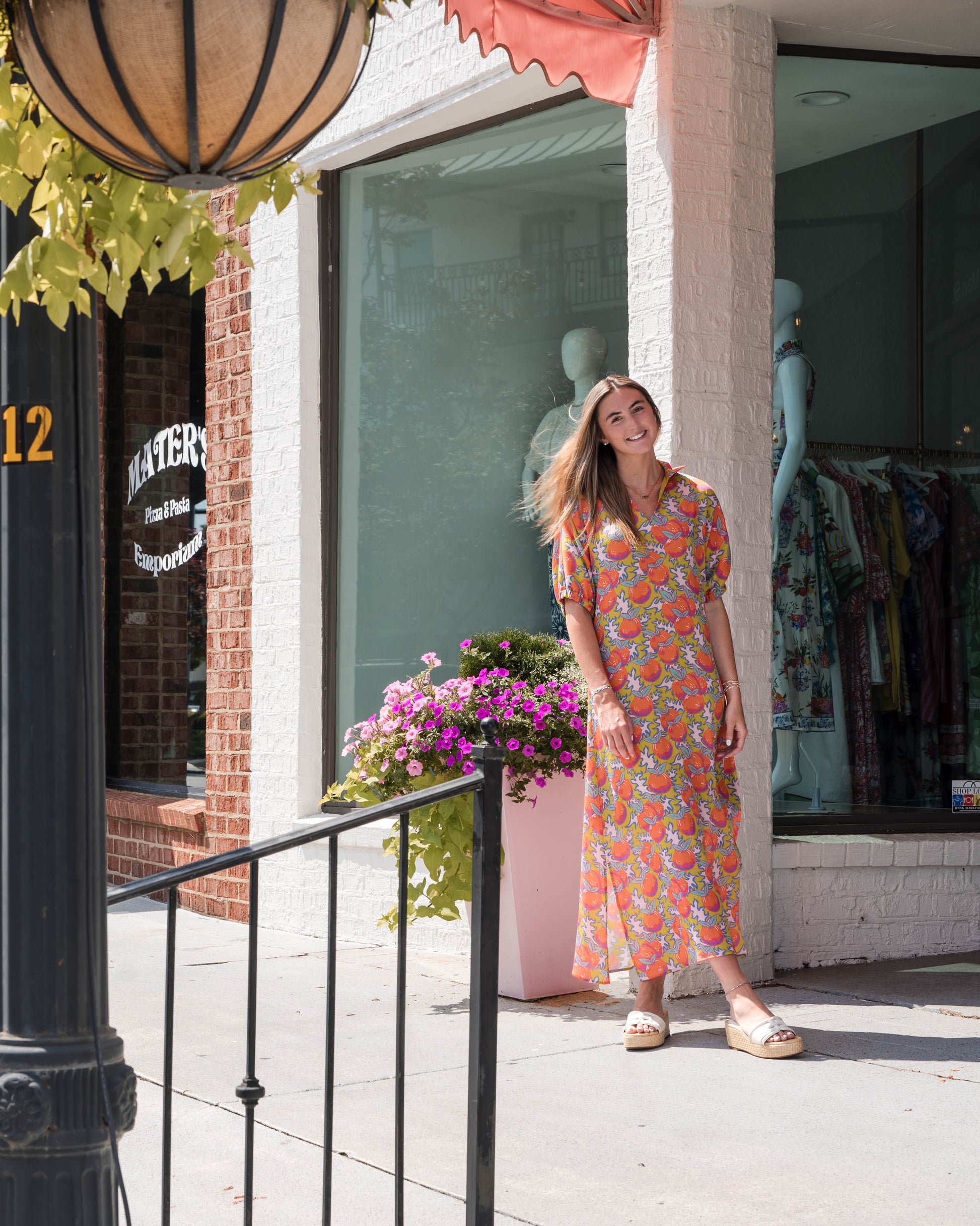 Breezy and effortless, the Poppy Maxi in Citrus Grove features a classic stand collar and relaxed dolman sleeves with soft elastic at the cuffs. Designed with an easy, loose-fitting silhouette, it offers all-day comfort without sacrificing style. The lightweight crinkled fabric enhances its airy feel, making it ideal for warm weather. A playful citrus-inspired print adds a splash of vibrant energy, perfect for sunny days and spontaneous getaways.