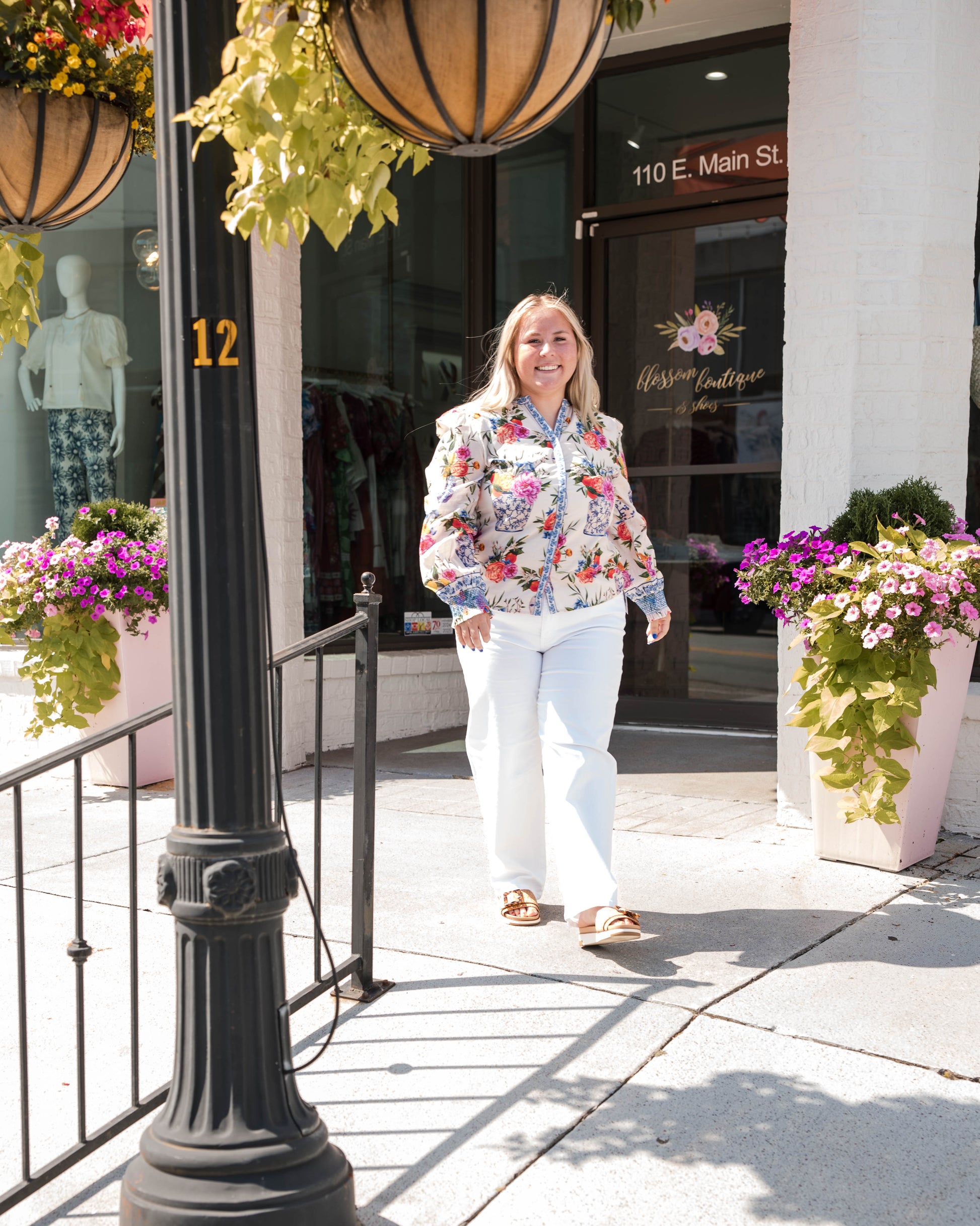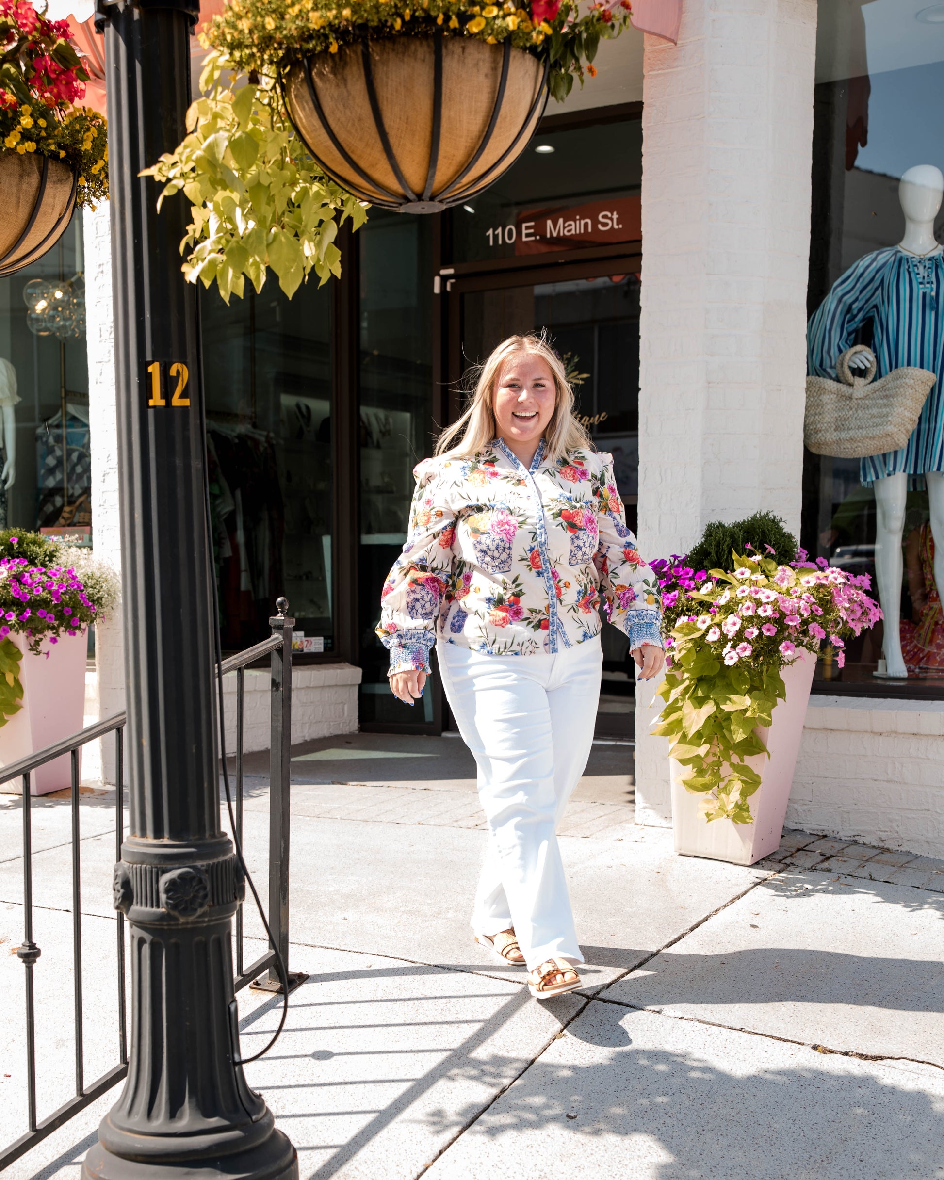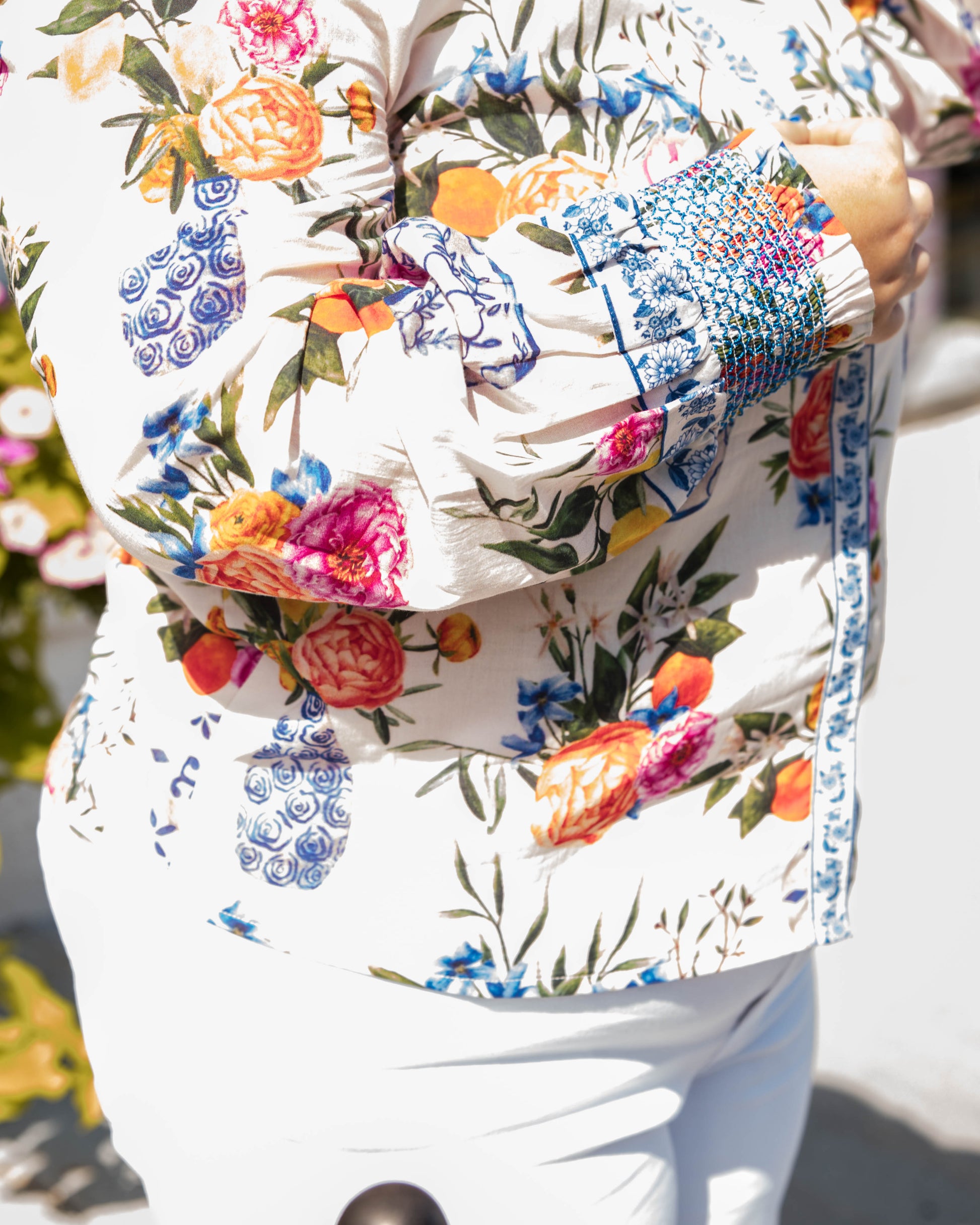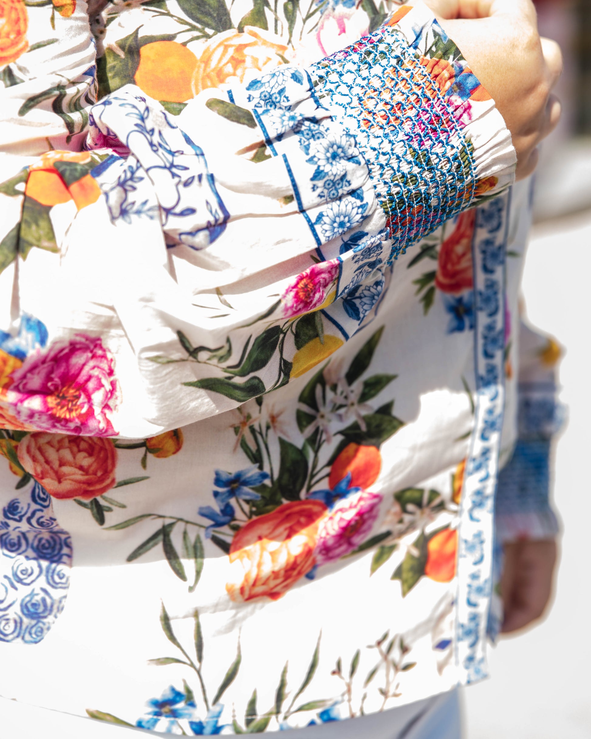 Cut from a light cotton blend fabric, the Emily Top in Ivory Ginger Jars is the perfect button-down to dress up or down this season. She features a mandarin collar, covered placket, balloon sleeves, and a decorative border trim.