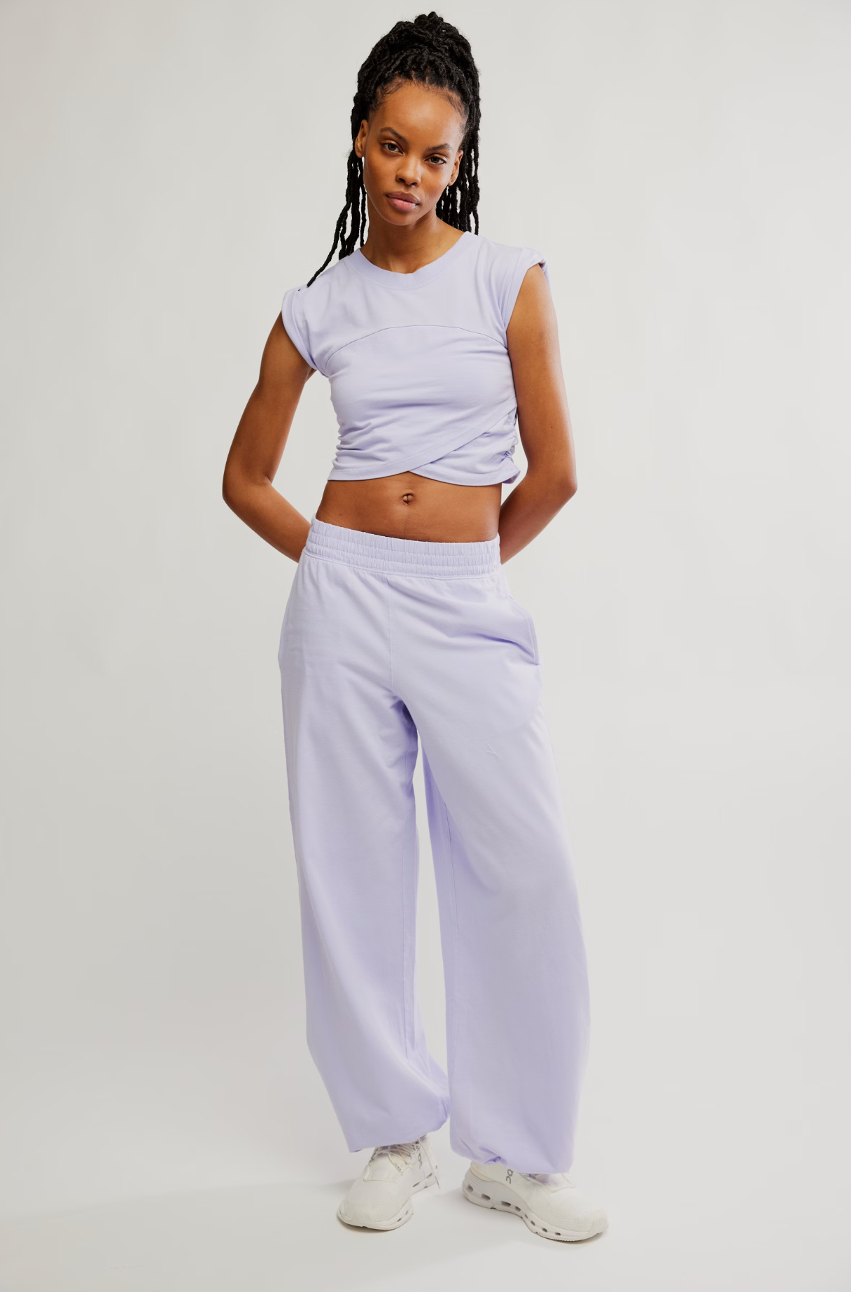 Features: Soft, jersey fabrication; relaxed fit; cropped muscle tee top with seaming detail; ankle length pant with high-rise waist and wide leg; elasticated waistband and cuffs; crossover detail on top; ribbed collar; side seam pockets