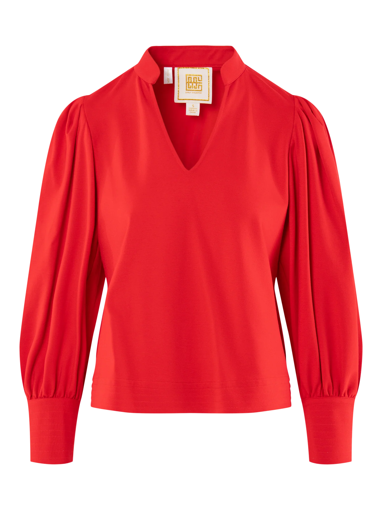 The Hampton Top in High Risk Red offers a refined take on everyday sophistication. Designed with a mandarin-style collar, blouson sleeves finished with structured cuffs, and a subtly tailored silhouette, this style delivers both polish and ease. Crafted from substantial ponte knit, it offers structure, comfort, and versatility—making it a timeless addition to your fall wardrobe for endless styling potential.
