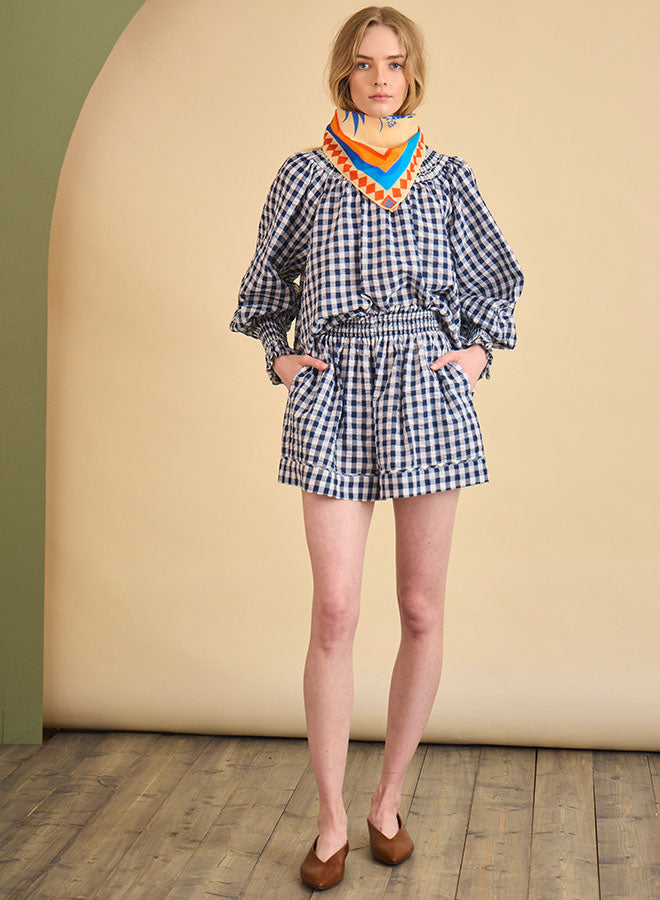 The Jemma Shorts are the perfect blend of comfort and style. Crafted from a specialty lightweight cotton blend in a playful navy and white gingham, they feature a smocked elastic waistband for an easy, flowy fit that moves with you. Pair them with the matching Hayes Blouse - Navy/White for a coordinated set.
