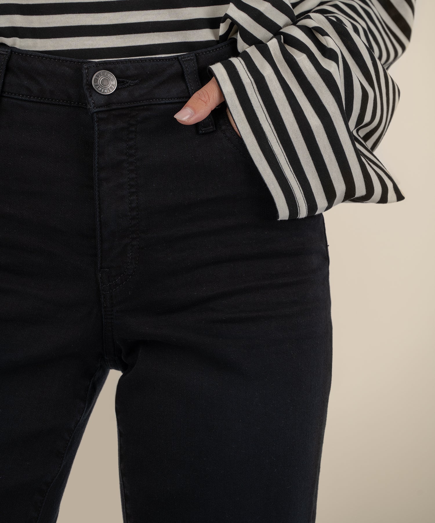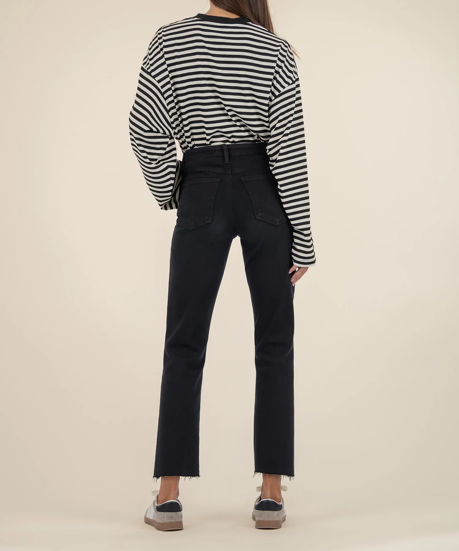 These high-rise ankle flare jeans feature our signature Fab Ab pockets for a flattering fit. With a trendy raw hem and a touch of stretch, they combine style and comfort for an effortlessly cool look.