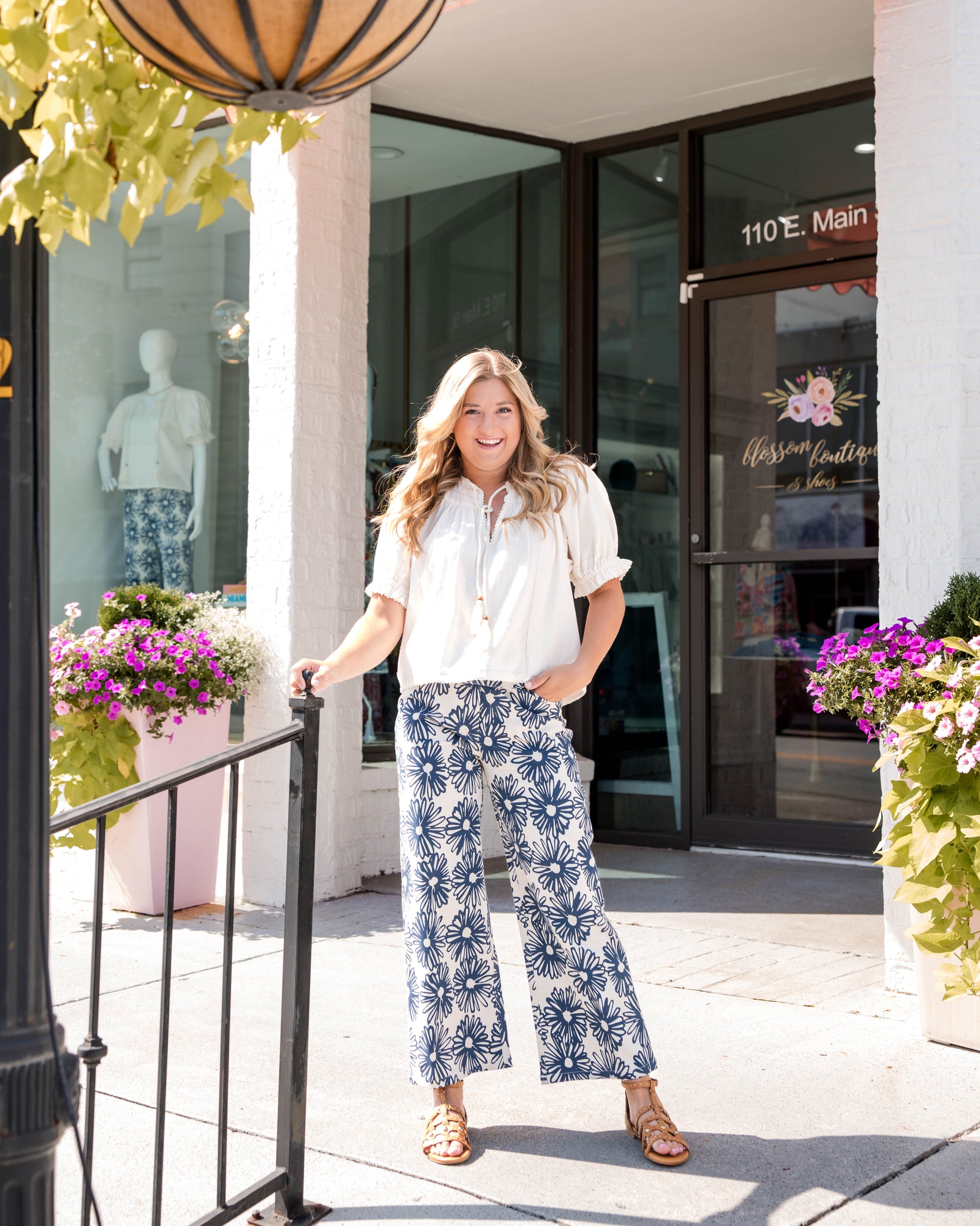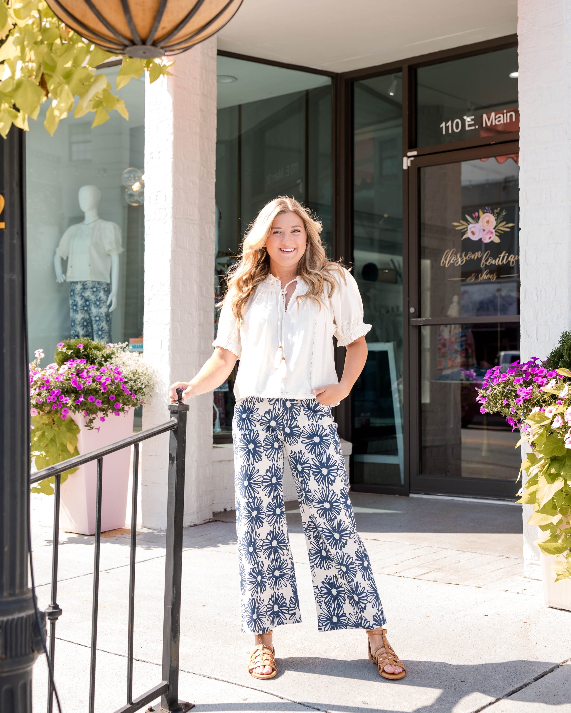 Kiki is the elevated white top every closet needs for Spring and Summer. Cut from a soft linen blend fabric and embellished with picot trim, open stitch detailing, and beaded cord ties, Kiki is perfect for pairing with all of your favorite printed or solid bottoms.