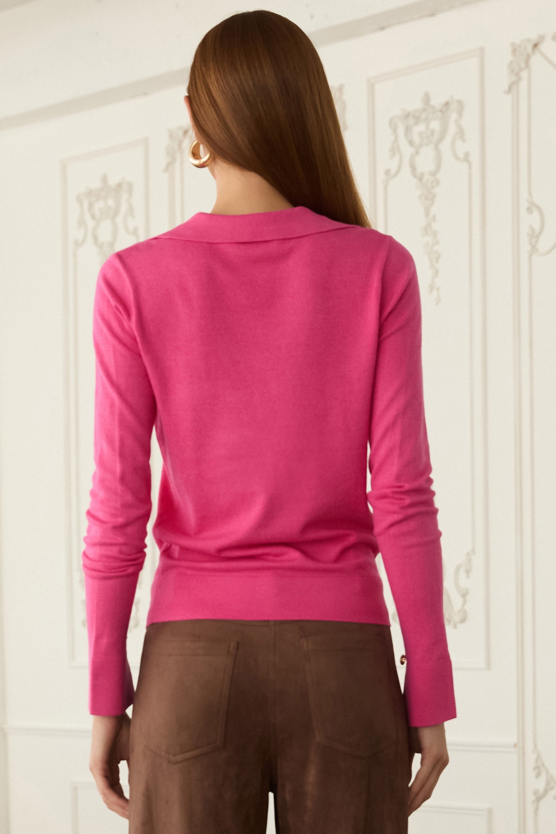 Classic meets cozy in this Long Sleeve Polo Knit Top, the perfect blend of tailored polish and everyday comfort. Crafted from a soft, stretchy knit, this top features a collared neckline with a subtle button placket and a flattering slim fit. The long sleeves and ribbed texture add just the right touch of warmth and sophistication, making it a wardrobe essential for layering or wearing on its own. Soft, stretchy knit fabric Classic polo collar with button placket Long sleeves Ribbed hem and cuffs for a refined finish Slim, flattering silhouette