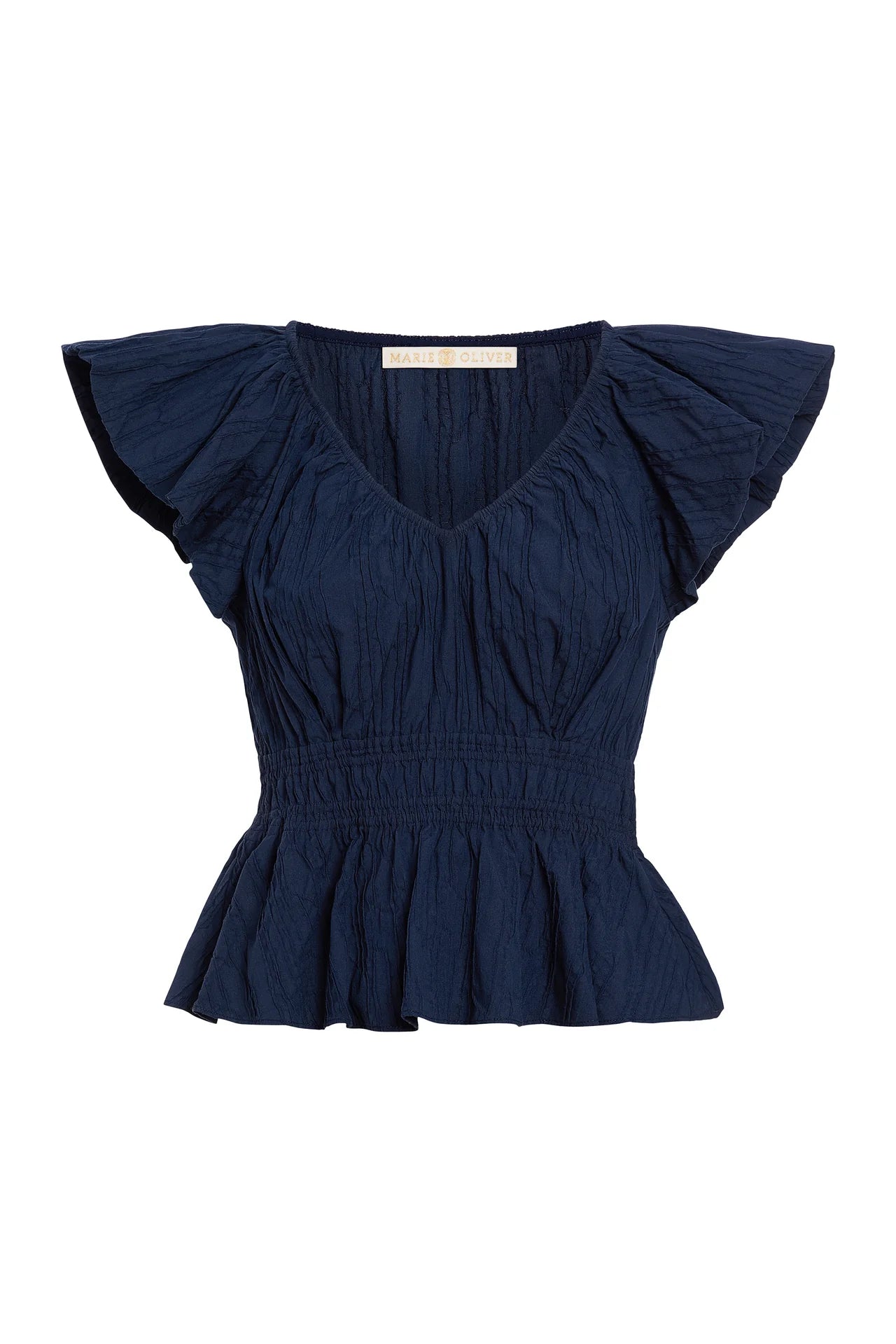 This feminine warm-weather top is defined by puff sleeves, gathered detailing, and a textured crinkle cotton fabrication that adds subtle interest. Offered in Naval blue, it pairs naturally with the coordinating Sasha Skirt - Naval.