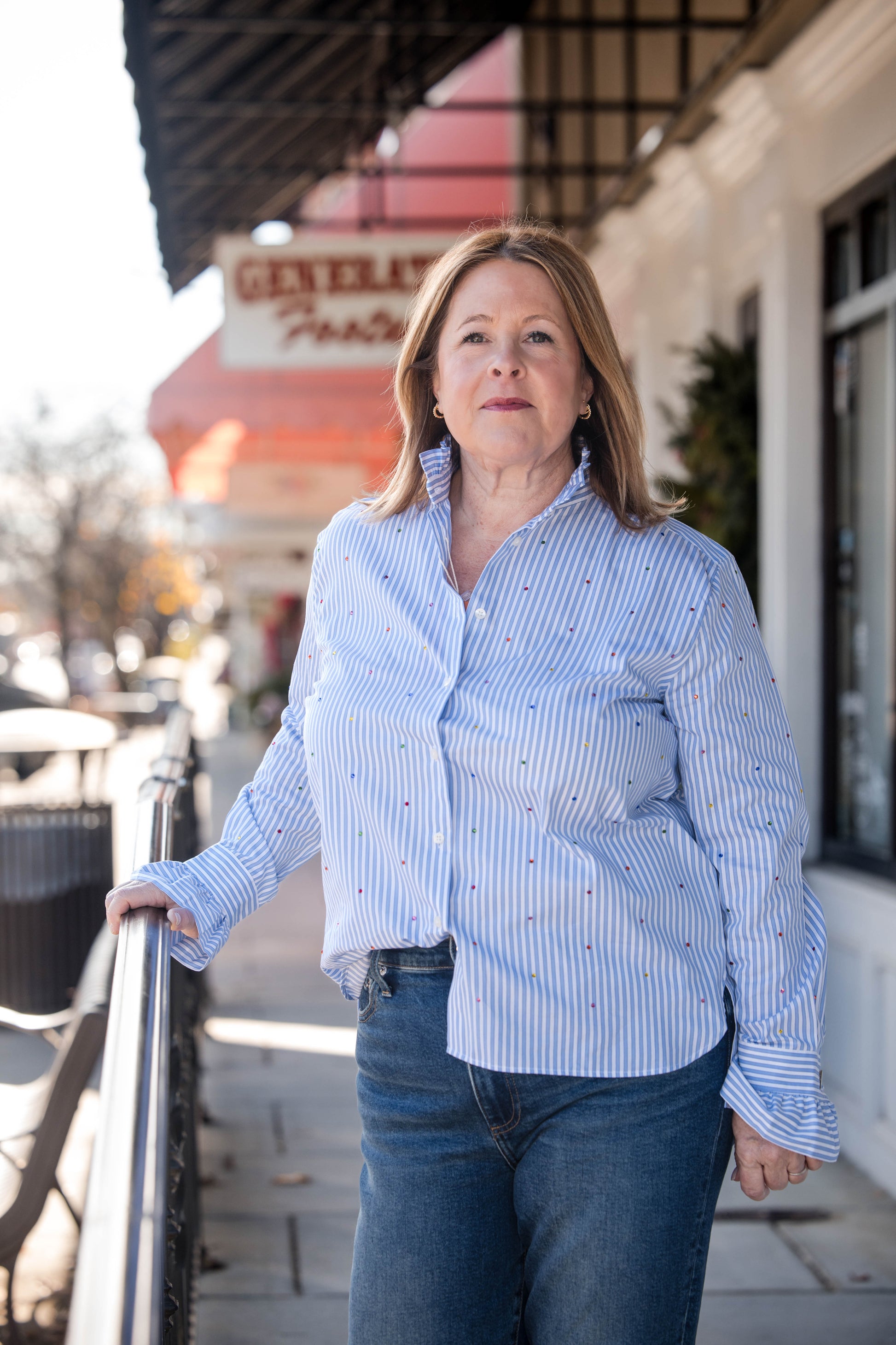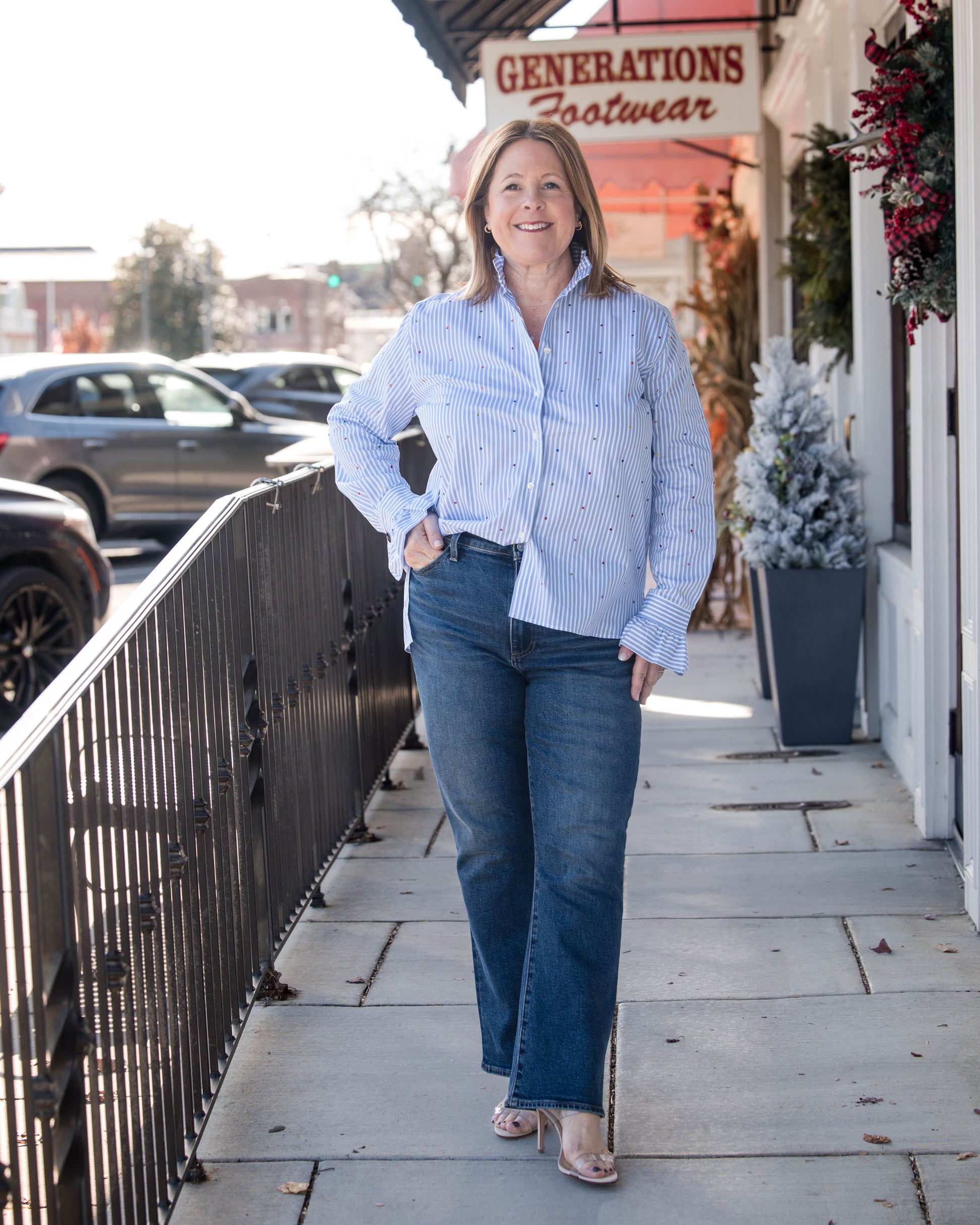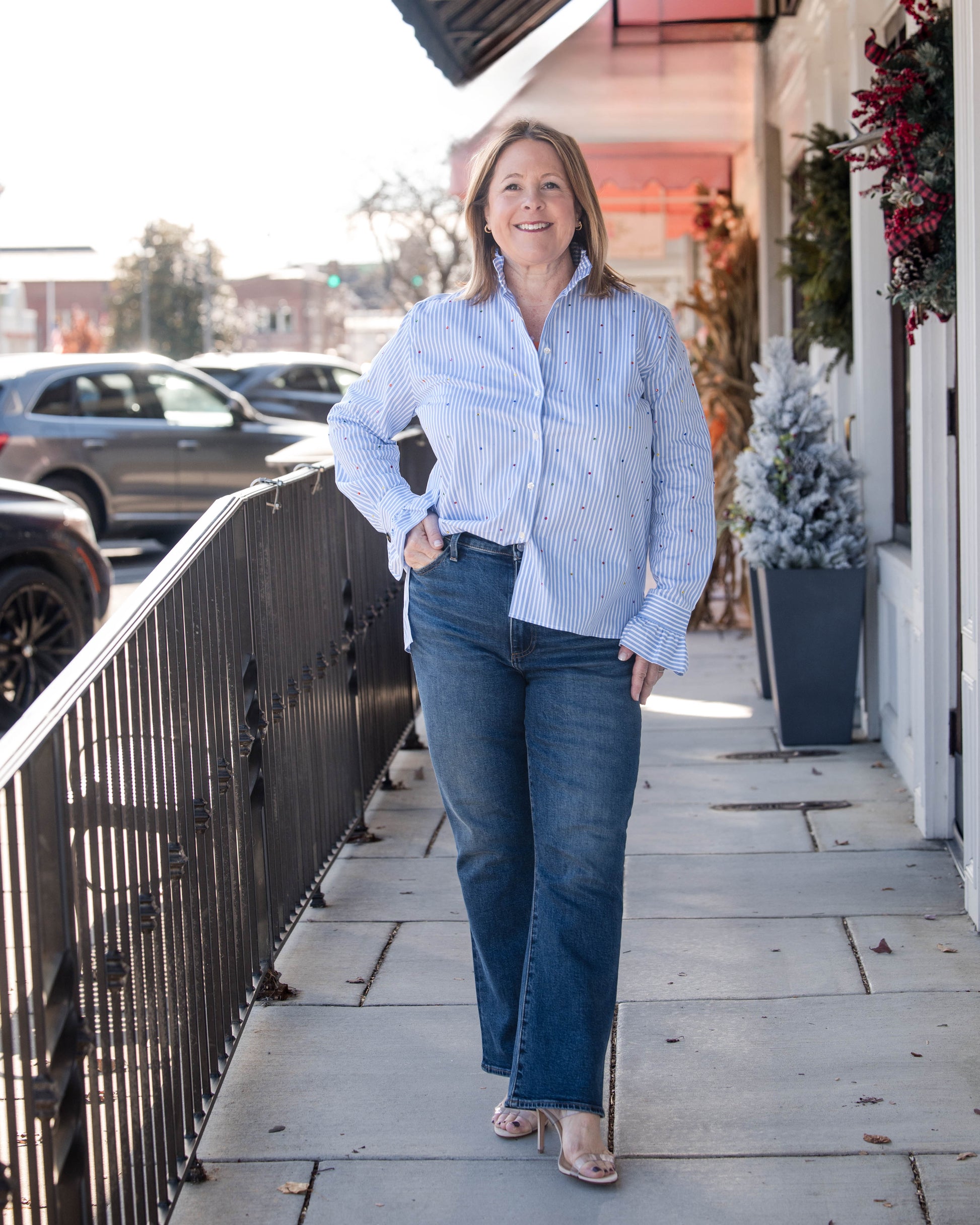 Pinstripe shirt in light blue with multicolor strass details on the front, sleeves and back. Features a frilled high collar and wide cuffs with pleated ruffle trim. Straight hem and visible front button closure. Structured fabric in 100% cotton.