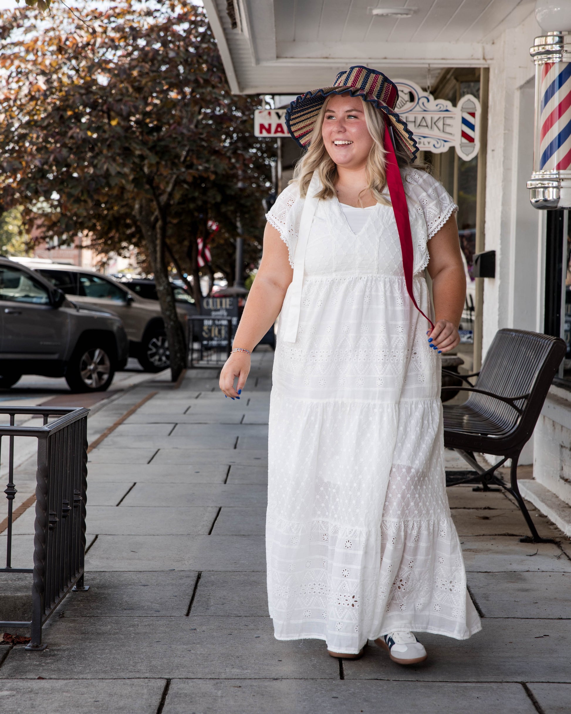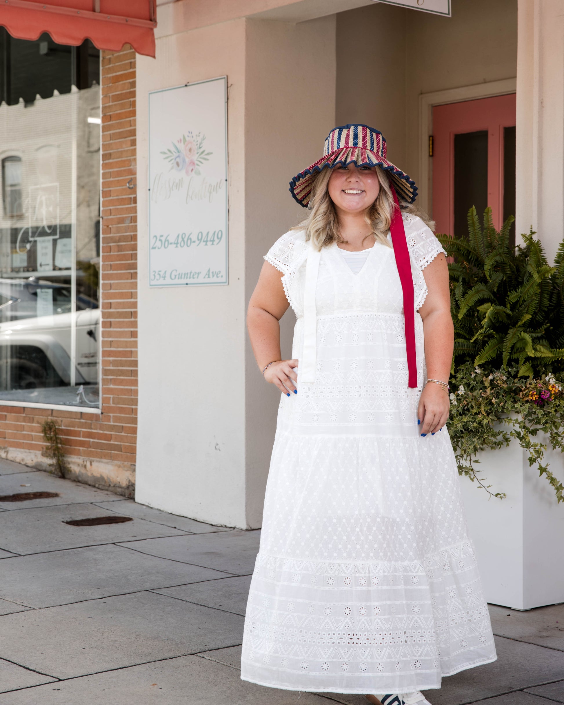 Pearl lace trim maxi dress in multi tiered eyelet fabric. This style features a classic V neckline, raglan flutter short sleeves with pearl lace trim, side pockets, maxi tiered skirt, and lining for comfort.