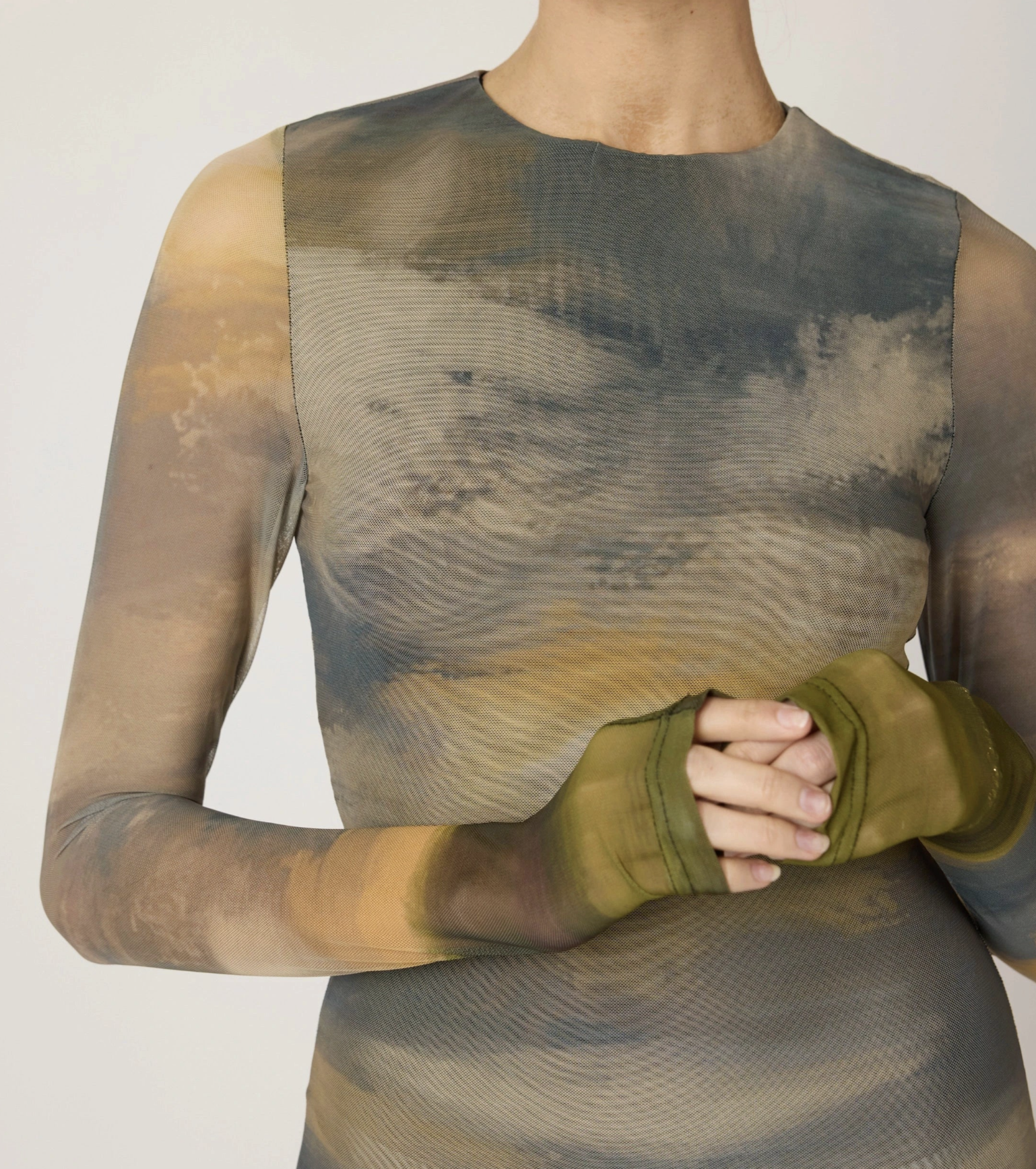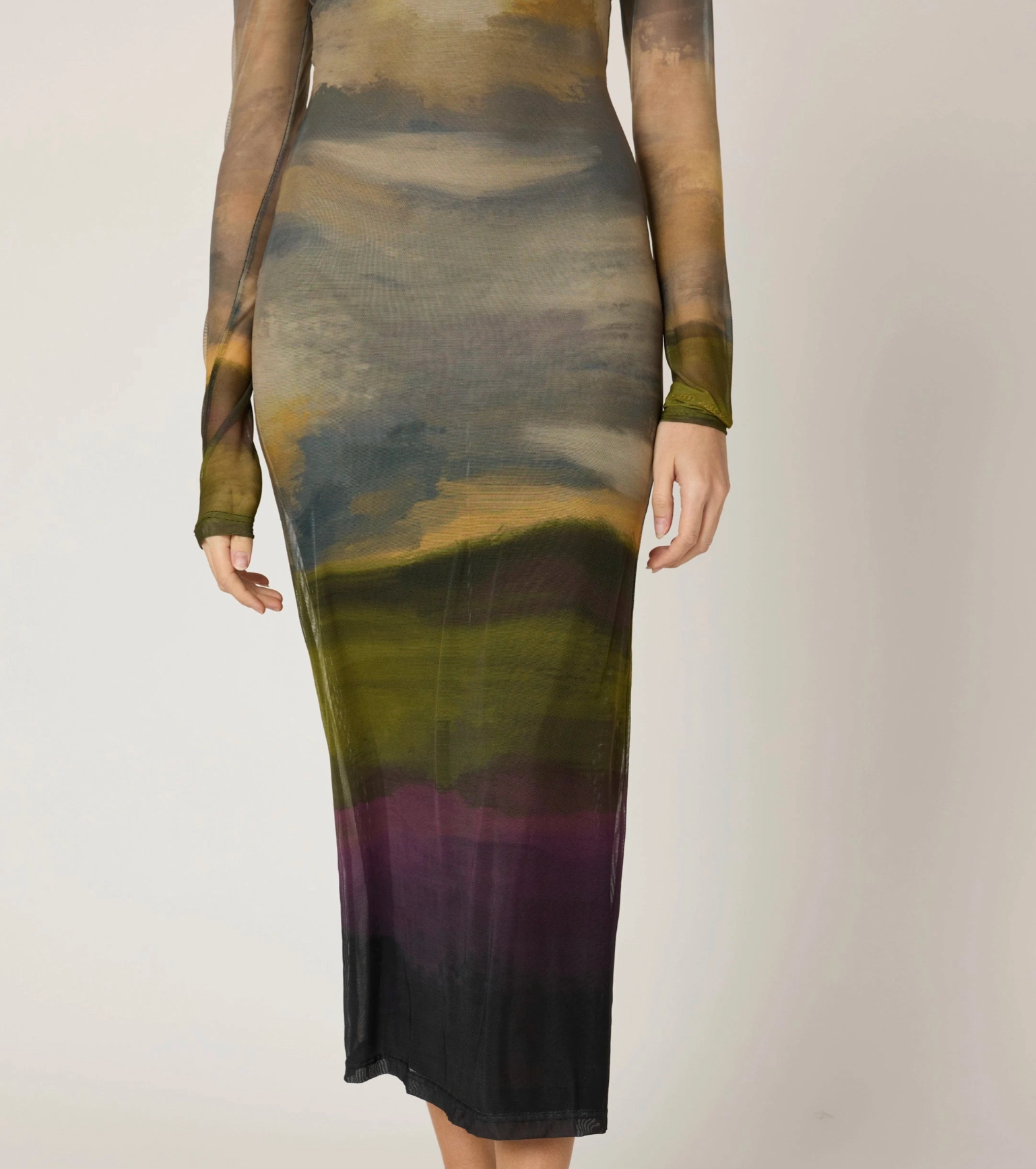 Ethically handmade in India from 88% recycled nylon and 12% elastane, the Persephone Ankle Dress is a sustainably crafted statement piece designed to stand out. This fitted mesh ankle-length dress features a hand-painted design and a delicate keyhole button closure at the back neck. Elegant and chic, it’s the perfect dress to elevate any fall occasion.