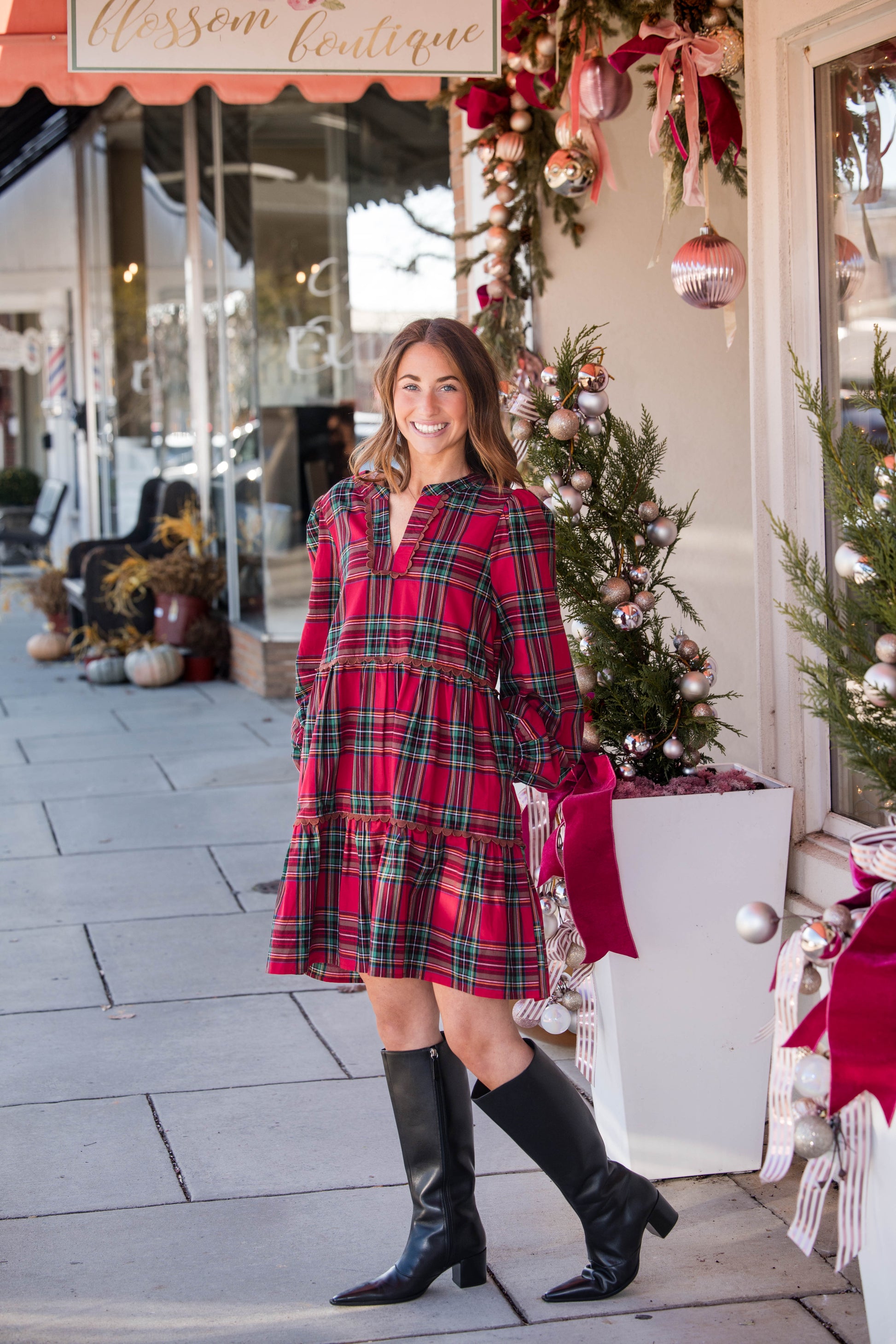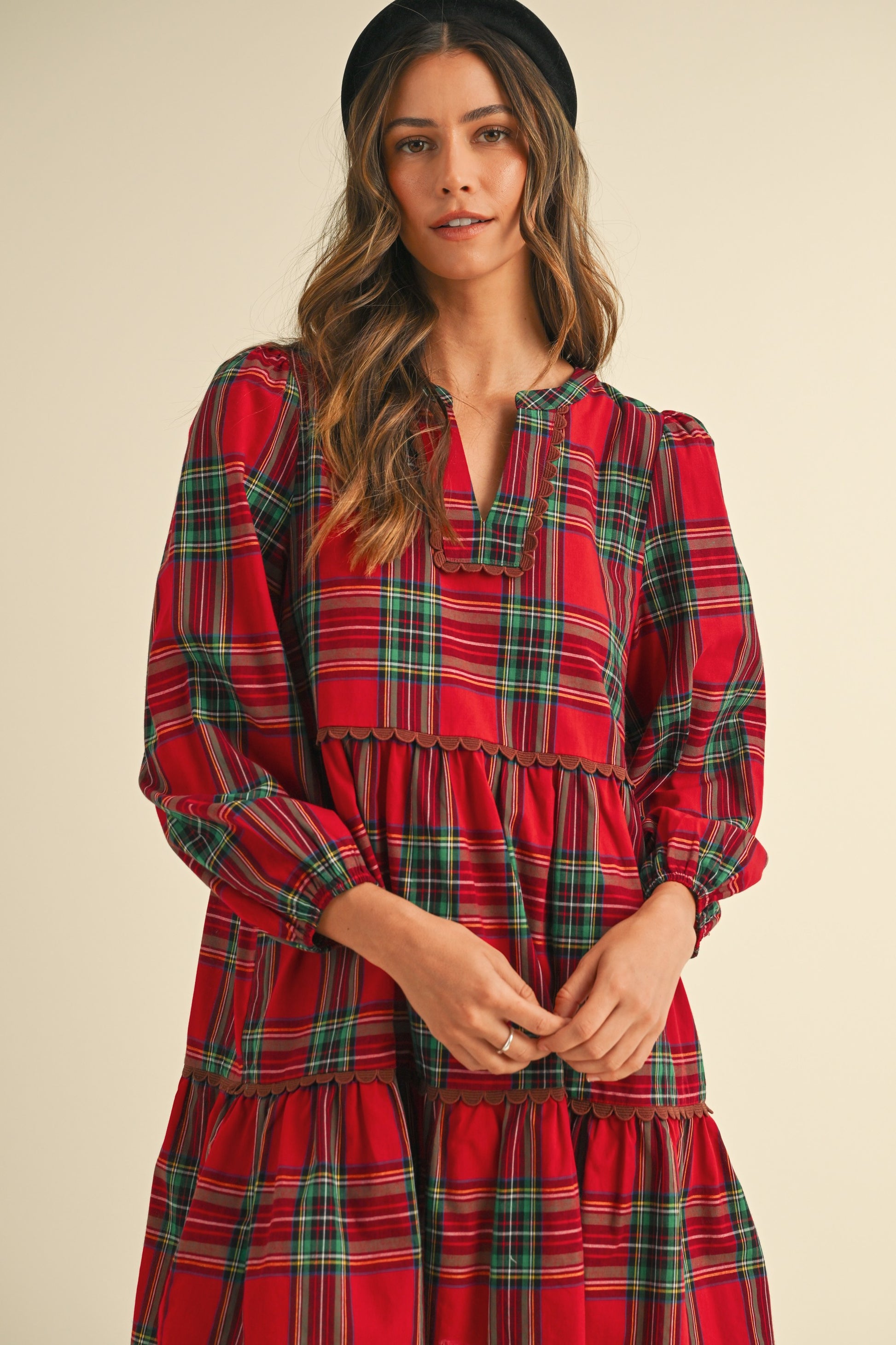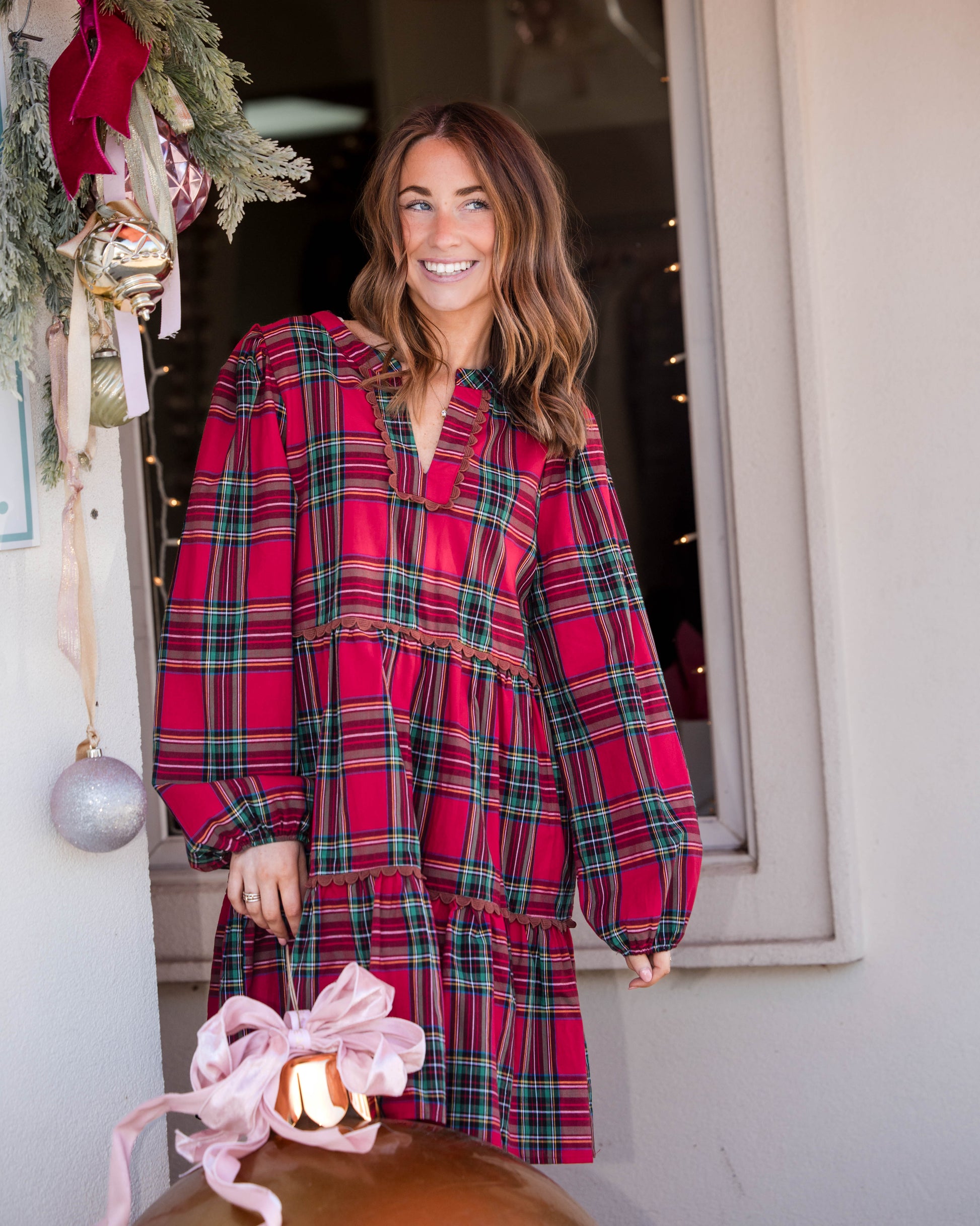Plaid Scallop Trim Detail Babydoll Mini Dress - Red