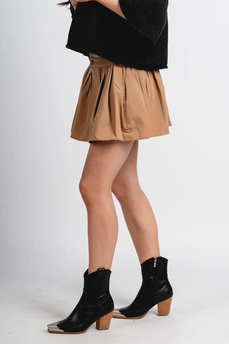 This pleated mini skort in tan is thoughtfully designed with pleated accents and side pockets for both style and convenience. Featuring belt loops and a front-rise zipper with button closure, it offers a comfortable and secure fit, making it a reliable choice for your everyday wardrobe.