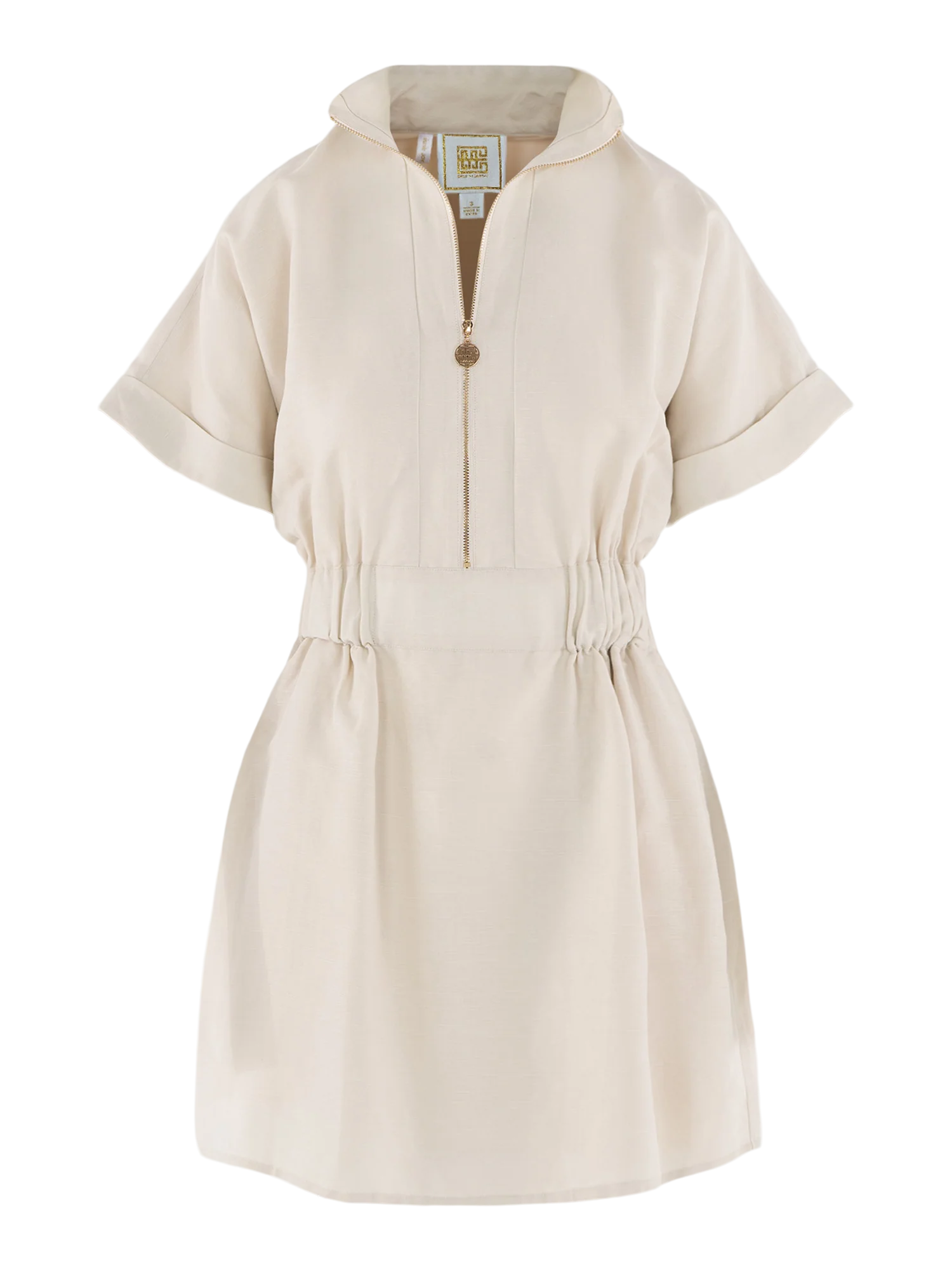 The Pullover Dress in Sandshell Linen is a sporty yet refined silhouette designed for effortless everyday wear. It features a classic stand collar with a front zip closure finished with our signature gold pull. Short folded dolman sleeves add a relaxed feel, while the cinched elastic waistband creates subtle shape through the body. Functional side pockets enhance wearability, making this an elevated basic that balances comfort, function, and polished design for day-to-day dressing.