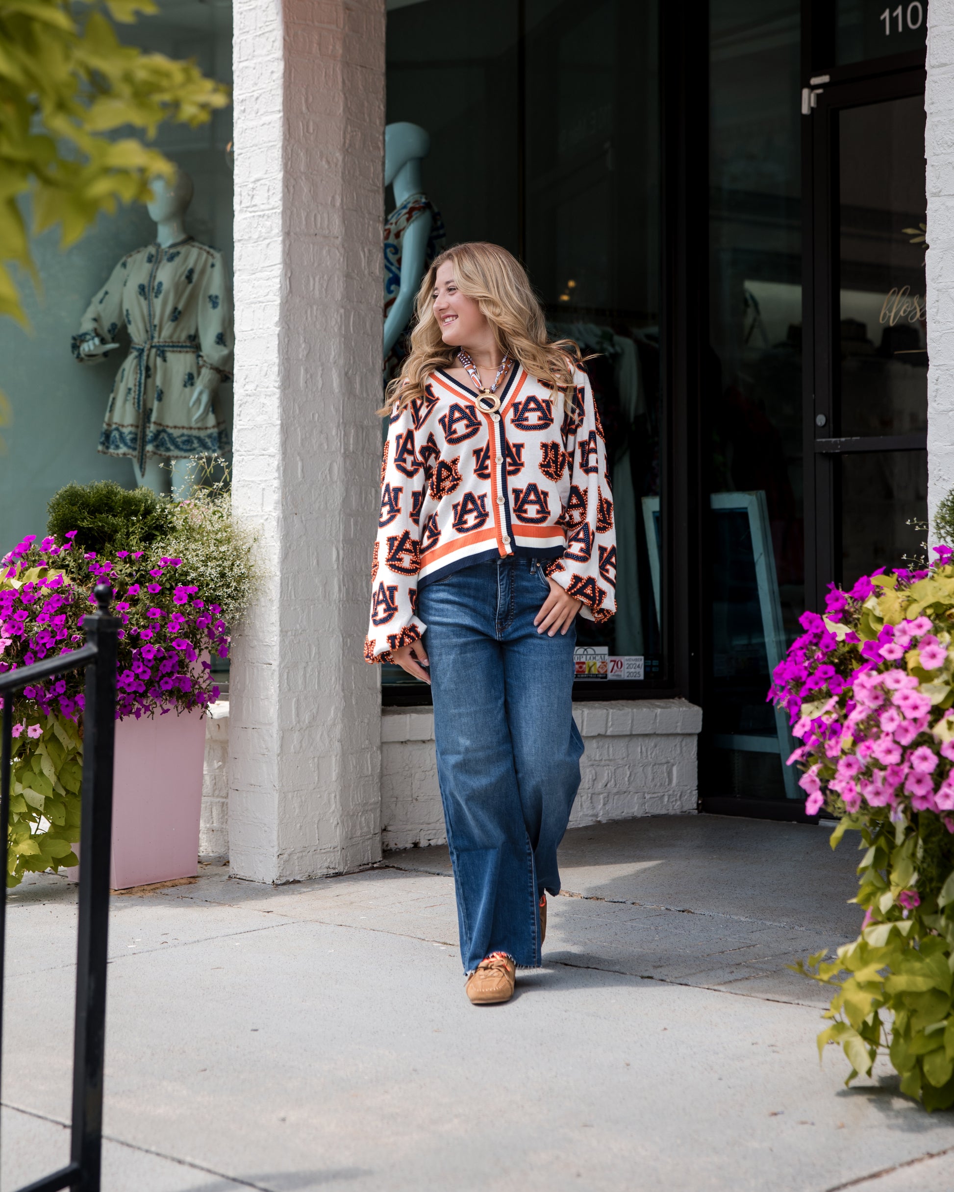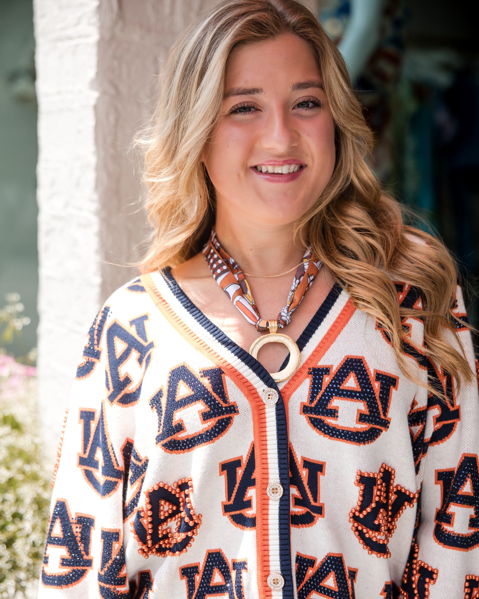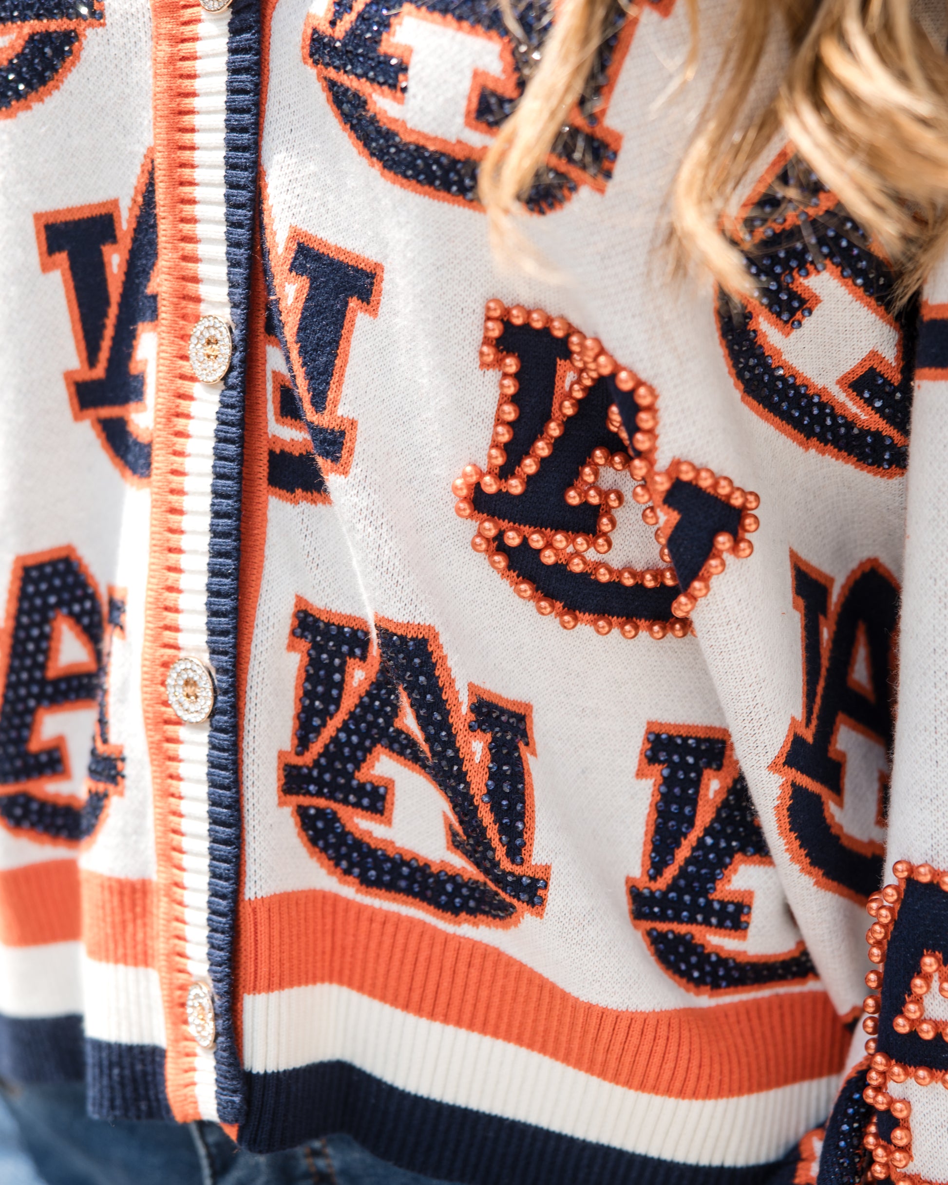 Show your team spirit in style with the Licensed Auburn Knit In Mascot Rhinestone Cardigan. This cozy yet eye-catching cardigan features a detailed knit-in mascot design accented with sparkling rhinestones, adding a touch of glamour to your game day look. Perfect for staying warm while standing out in the crowd, it combines comfort with spirited fashion, making it a must-have for any Auburn fan.