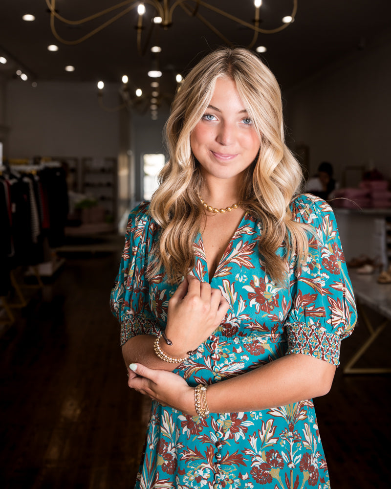Reese is a darling V neck midi dress, featuring a decorative button front bodice, slightly puffed short sleeves, and a flattering A-line skirt. Perfect for practically any occasion, we love Reese paired with kitten heels for a classic feminine look.