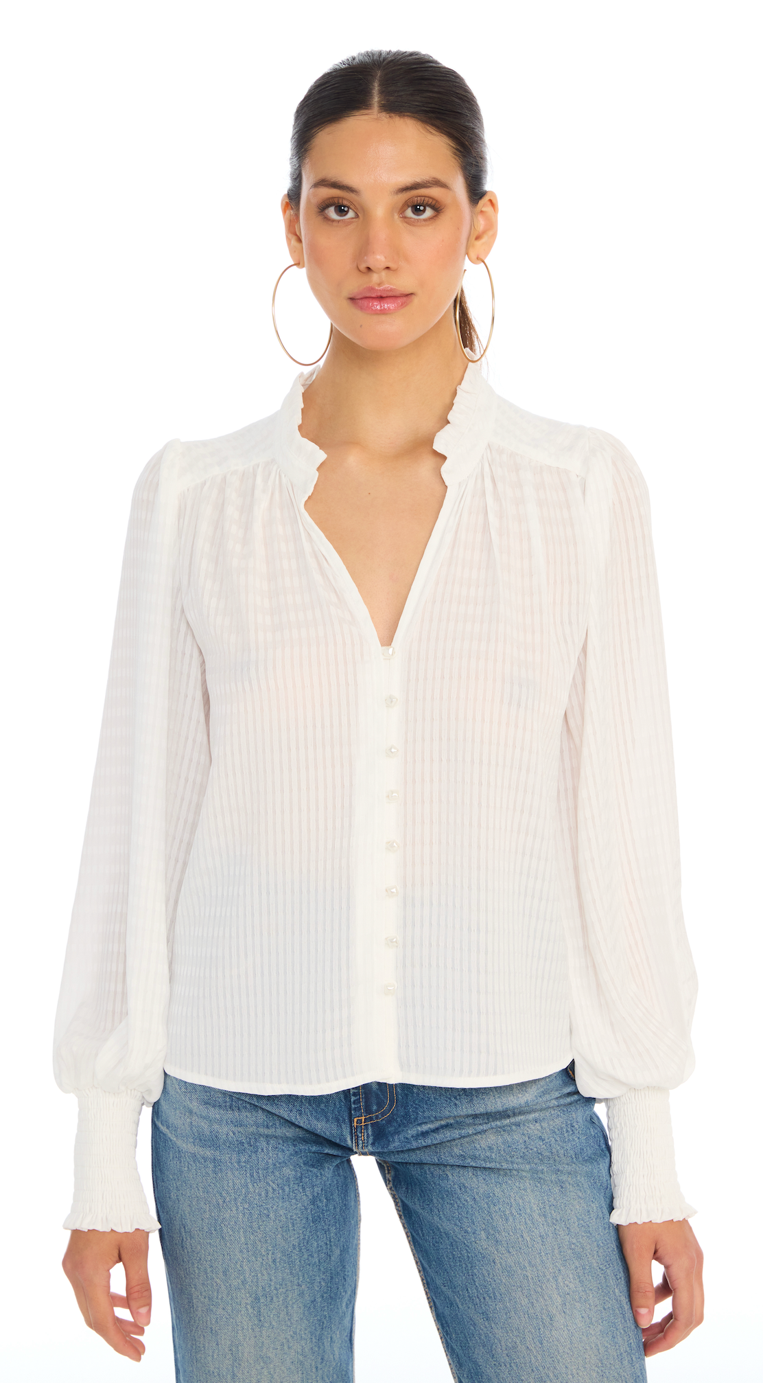 The Rhode Blouse is an instant classic; Designed with a split v neckline and a ruffle collar. Pearl buttons at the center front offer a feminine touch. Long sleeves end in a smocked cuff. Cut in a lightweight jacquard fabrication with a loose fit throughout the body and sleeves and is unlined.