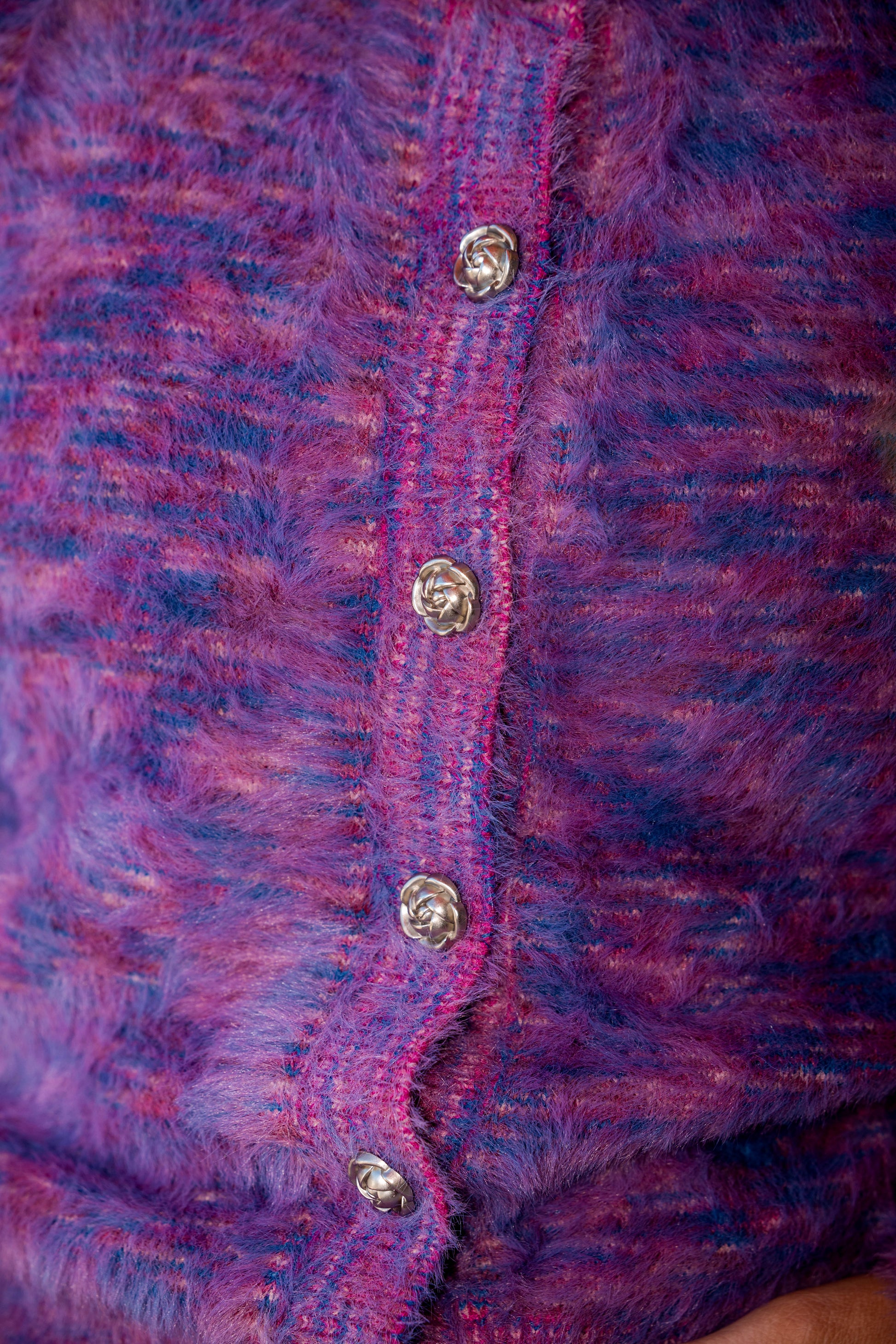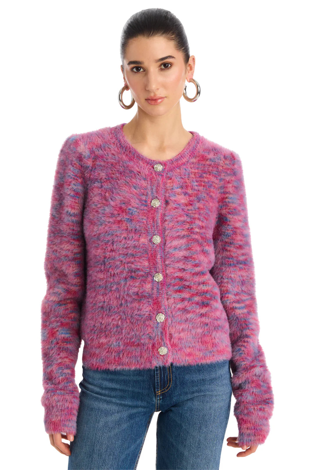 The Sloan Cardigan is designed in a super soft fuzzy knit with pink and blue hued space-dye yarns. Add a touch of feminine style: featuring silver floral buttons at the center front opening.