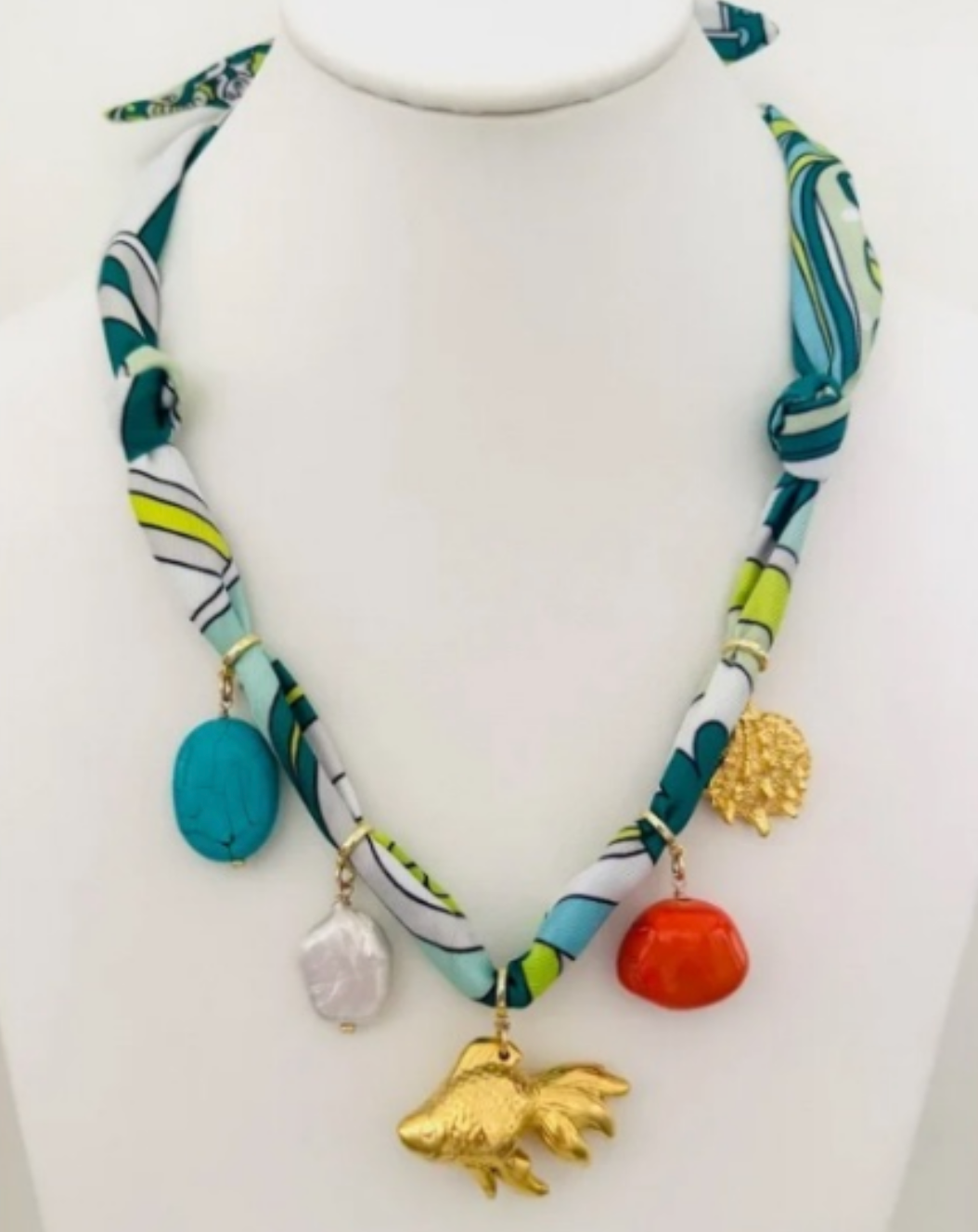 Green abstract twilly with 5 charms + bubble fish