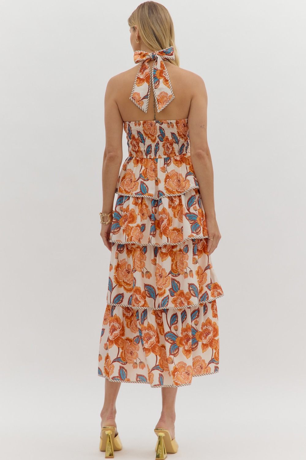 Floral print tiered bow tie halter midi dress featuriung contrast accented binding finish. Smocking closure at back. Lined. Woven. Non-sheer. Lightweight.