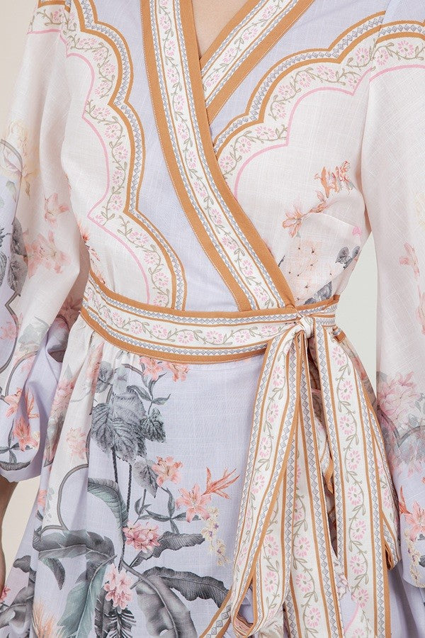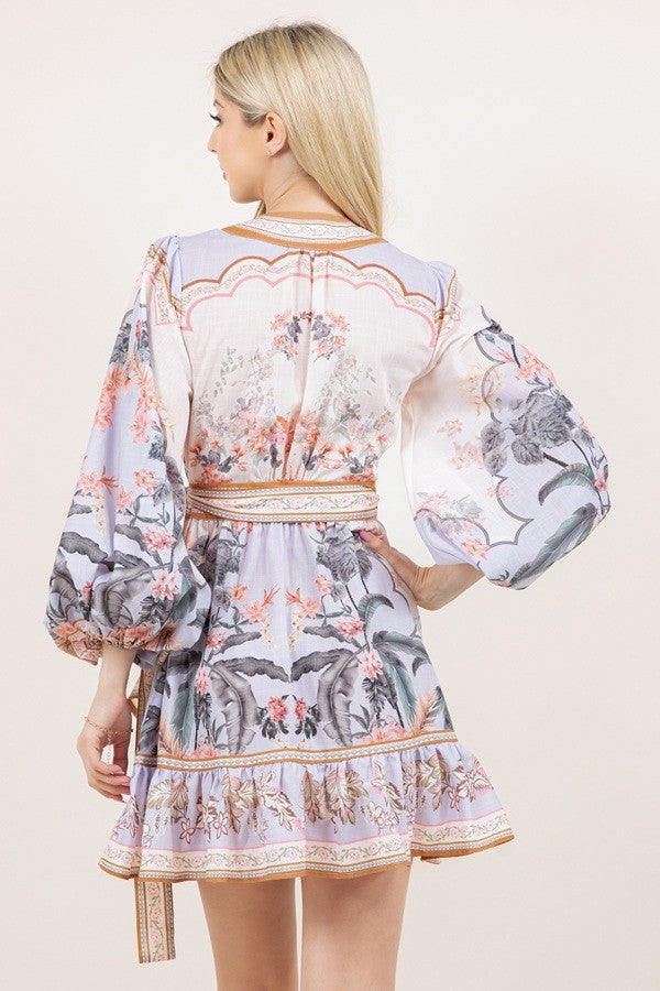 CUTE PRINTED PUFF SLEEVE WRAP WAIST DRESS